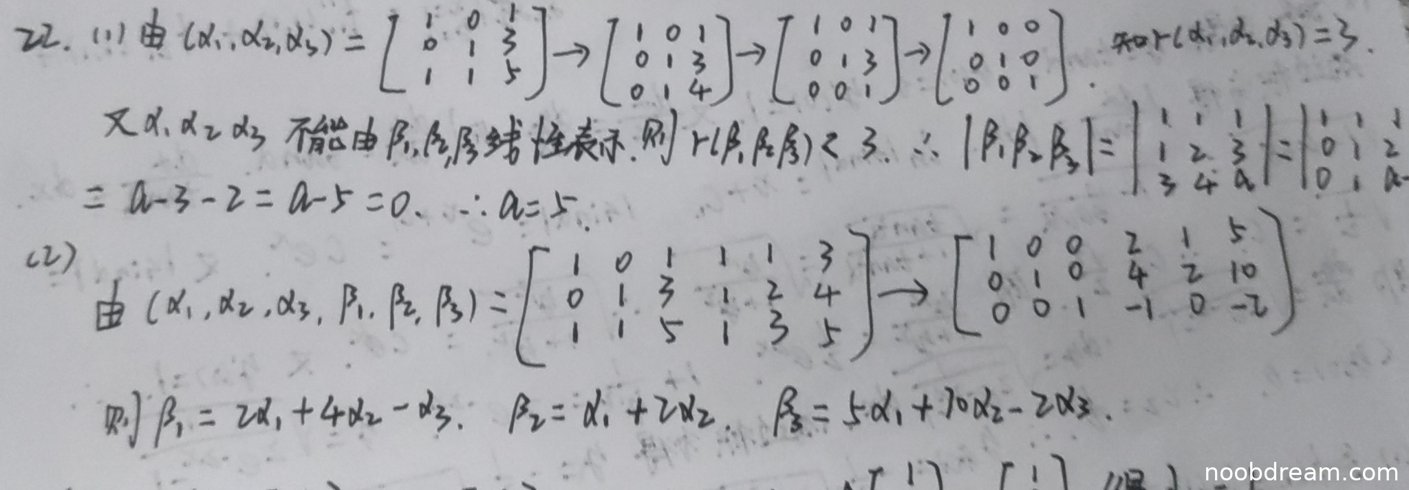 第1次识别结果中,矩阵书写有明显错误(如出现4行、分数形式等),但核心逻辑正确:先证明α₁,α₂,α₃线性无关(秩为3),再由"α组不能由β组线性表示"推出β组线性相关(秩小于3),最后通过行列式求a=5。计算过程虽有书写混乱,但最终结果正确。扣1分主要因矩阵表达不规范影响阅读,但核心逻辑和结果正确。得4.5分。