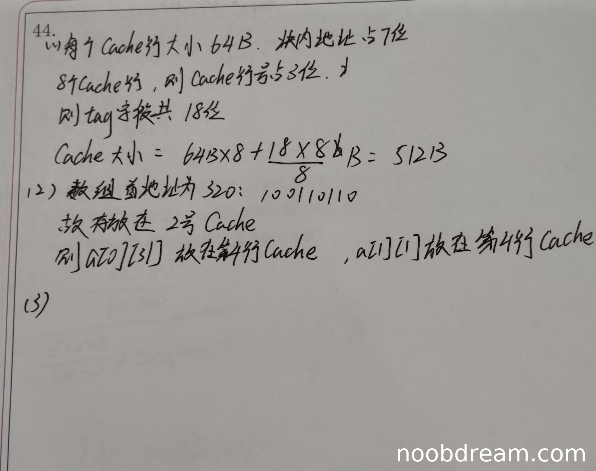 学生答案:Cache大小 = 64B×8 + 18×8÷8 B = 512B