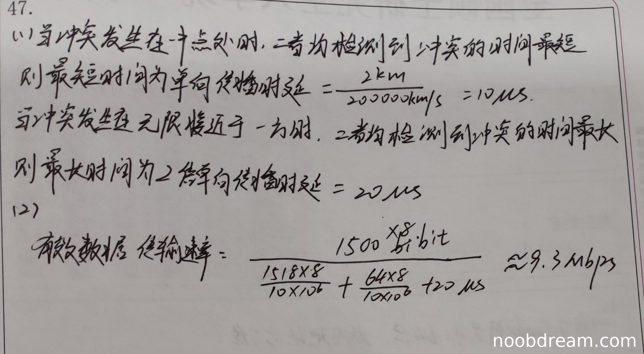 学生答案中,有效数据传输速率计算公式正确,包含了数据帧发送时延、确认帧发送时延和双程传播时延(20μs),计算结果近似正确(9.3 Mbps),与标准答案(9.33 Mbps)基本一致。但学生使用了"有效数据层传输速率"这一表述,可能存在术语不准确,但核心计算和思路正确,且属于识别或表述细节问题,不扣分。因此得5分。