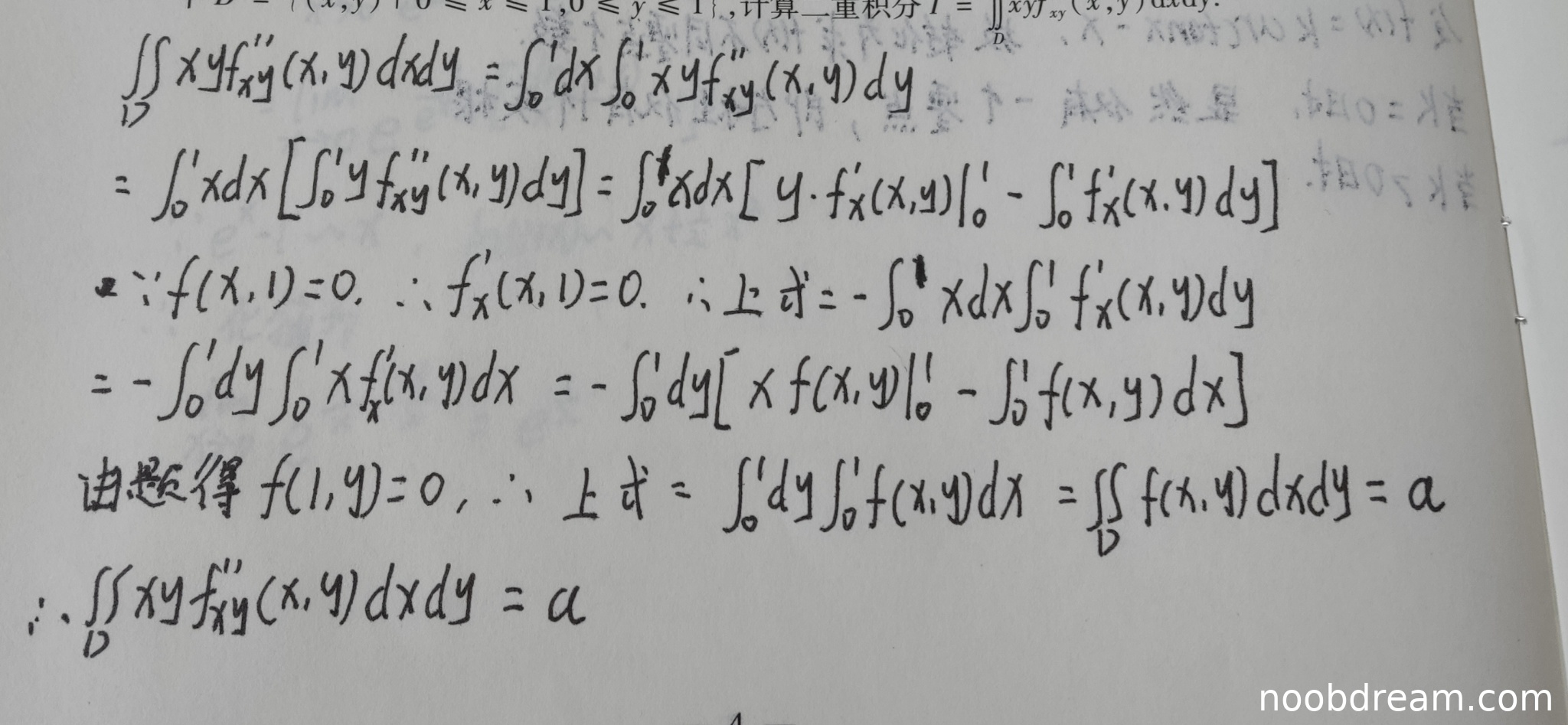 学生作答提供了两次识别结果,但两次内容本质相同,均展示了完整的解题过程。该过程与标准答案思路一致,均通过两次分部积分和交换积分次序的方法求解。具体步骤清晰:首先将二重积分化为累次积分,对y的积分进行分部积分,利用条件f(x,1)=0简化;然后交换积分次序,再对x的积分进行分部积分,利用条件f(1,y)=0简化,最终得到结果a。计算过程正确,逻辑严谨,且最终答案正确。根据打分要求,思路正确且无逻辑错误,应得满分。