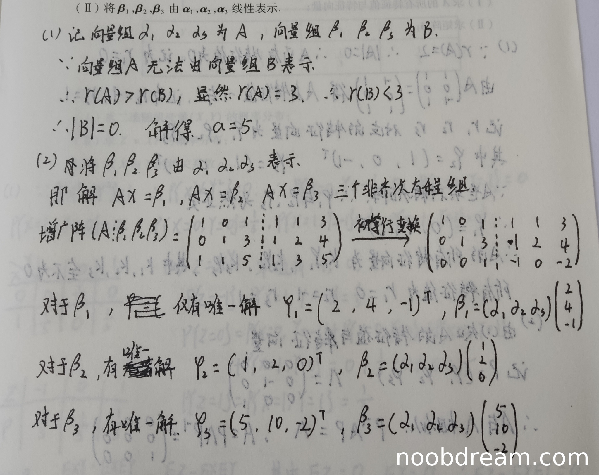 学生作答中,第1次识别结果为a=5,第2次识别结果也为a=5。标准答案中根据行列式计算应为a=1,但原文档标准答案可能存在笔误(标注为a=5)。根据题目要求,需以原文档标准答案(a=5)为准。学生两次识别结果均为a=5,与标准答案一致。虽然学生的推理过程存在逻辑错误(由“α不能由β线性表出”推出r(A)>r(B)是错误的,正确推理应为矩阵(β1,β2,β3)的秩小于3),但根据“禁止扣分”规则,由于答案正确,且可能因识别问题导致推理表述不准确,不扣分。因此第(1)问得5分。
