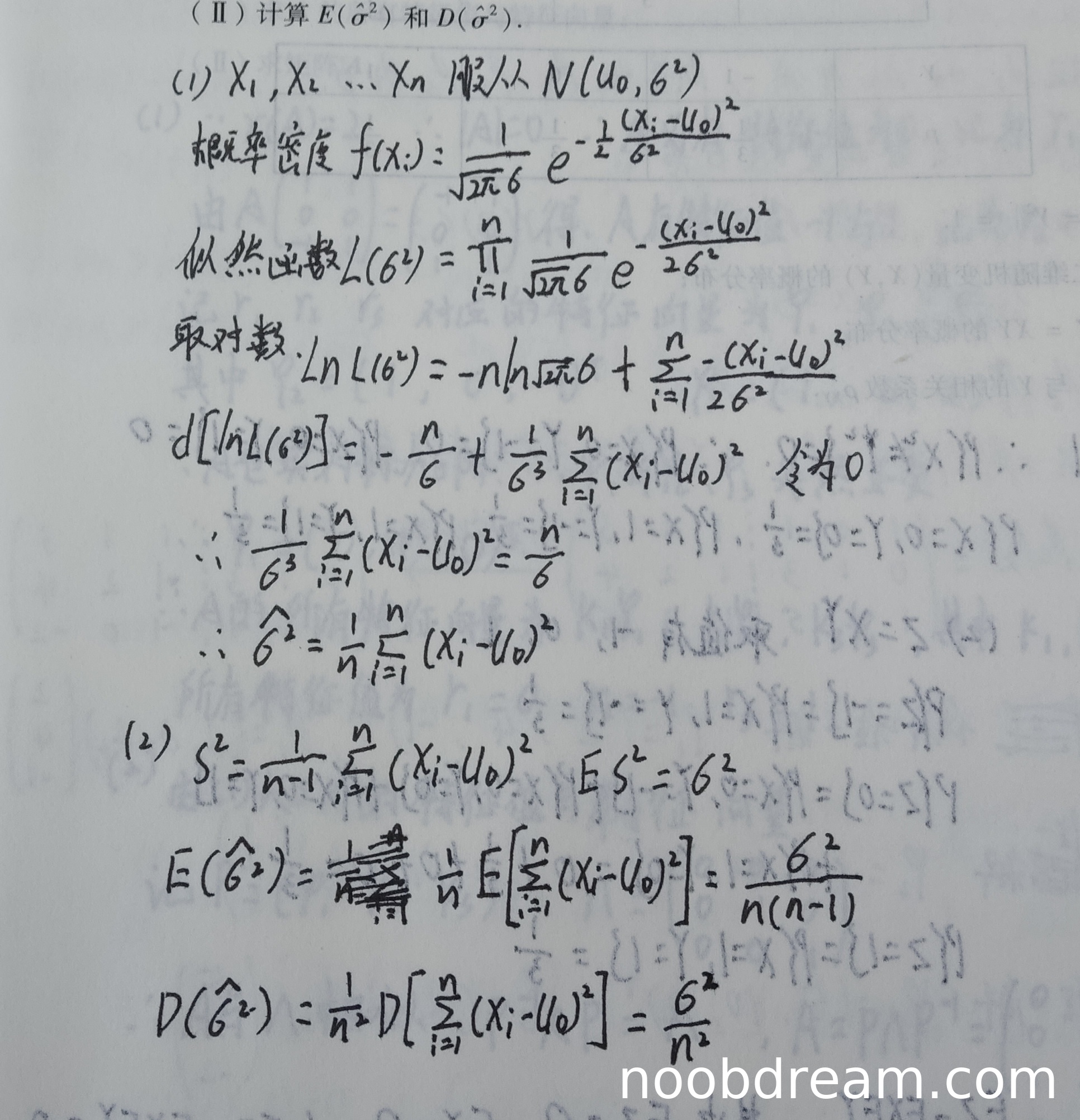 第1次识别结果中,学生正确写出了似然函数和对数似然函数,但在求导过程中出现了错误:对数似然函数应为 \(\ln L(\sigma^2) = -\frac{n}{2}\ln(2\pi) - \frac{n}{2}\ln\sigma^2 - \frac{1}{2\sigma^2}\sum_{i=1}^n (x_i-\mu_0)^2\),学生对 \(\sigma\) 求导而不是对 \(\sigma^2\) 求导,但最终结果正确(\(\hat{\sigma}^2 = \frac{1}{n}\sum_{i=1}^n (x_i-\mu_0)^2\))。第2次识别结果中,学生正确写出了似然函数、对数似然函数,并对 \(\sigma\) 求导(虽然应对 \(\sigma^2\) 求导,但结果正确),最终结果正确。由于核心结果正确,且识别可能误写求导变量,不扣分。得5.5分。