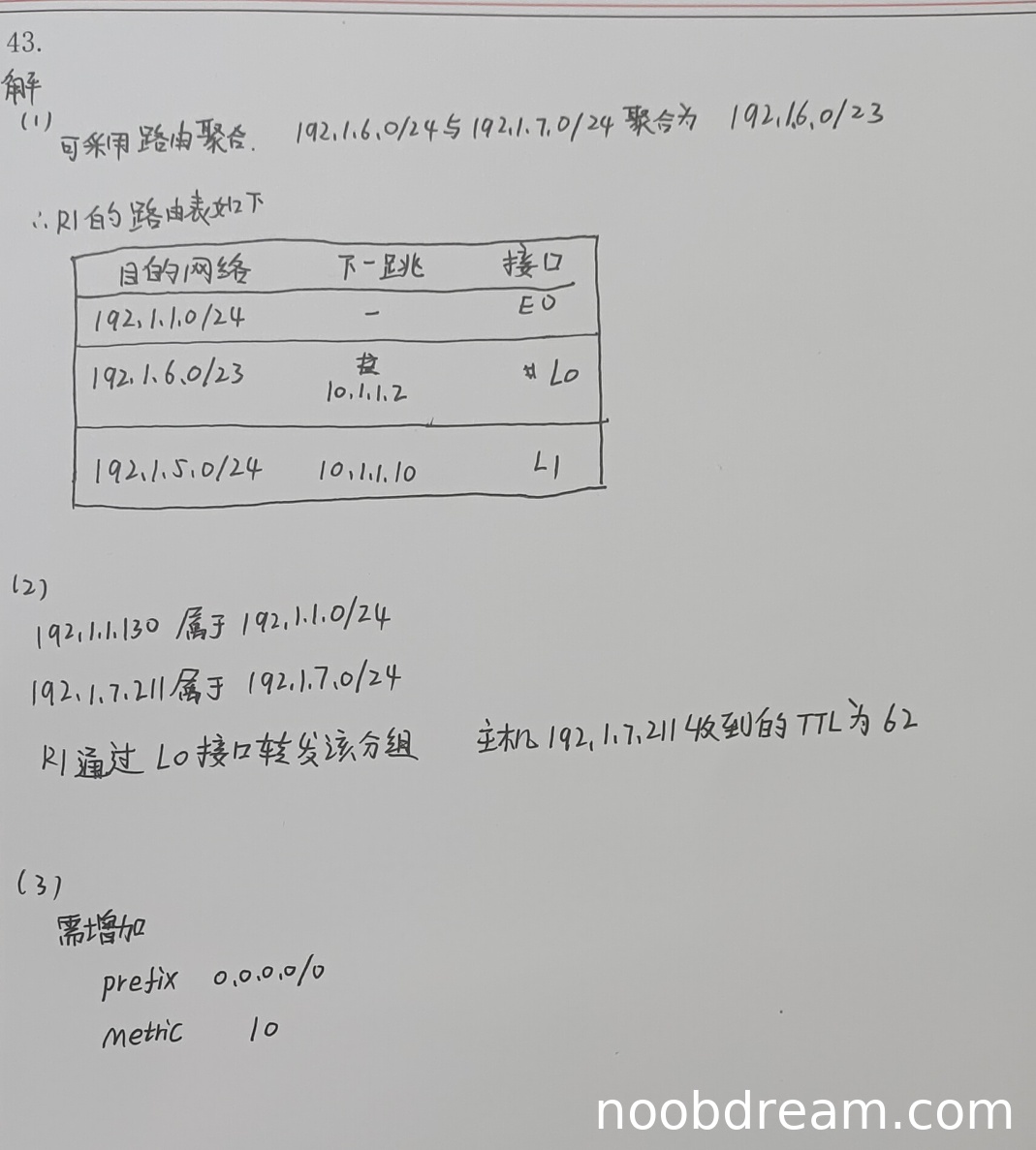 学生正确指出需增加前缀0.0.0.0/0和度量值10,与标准答案一致。因此得1分。