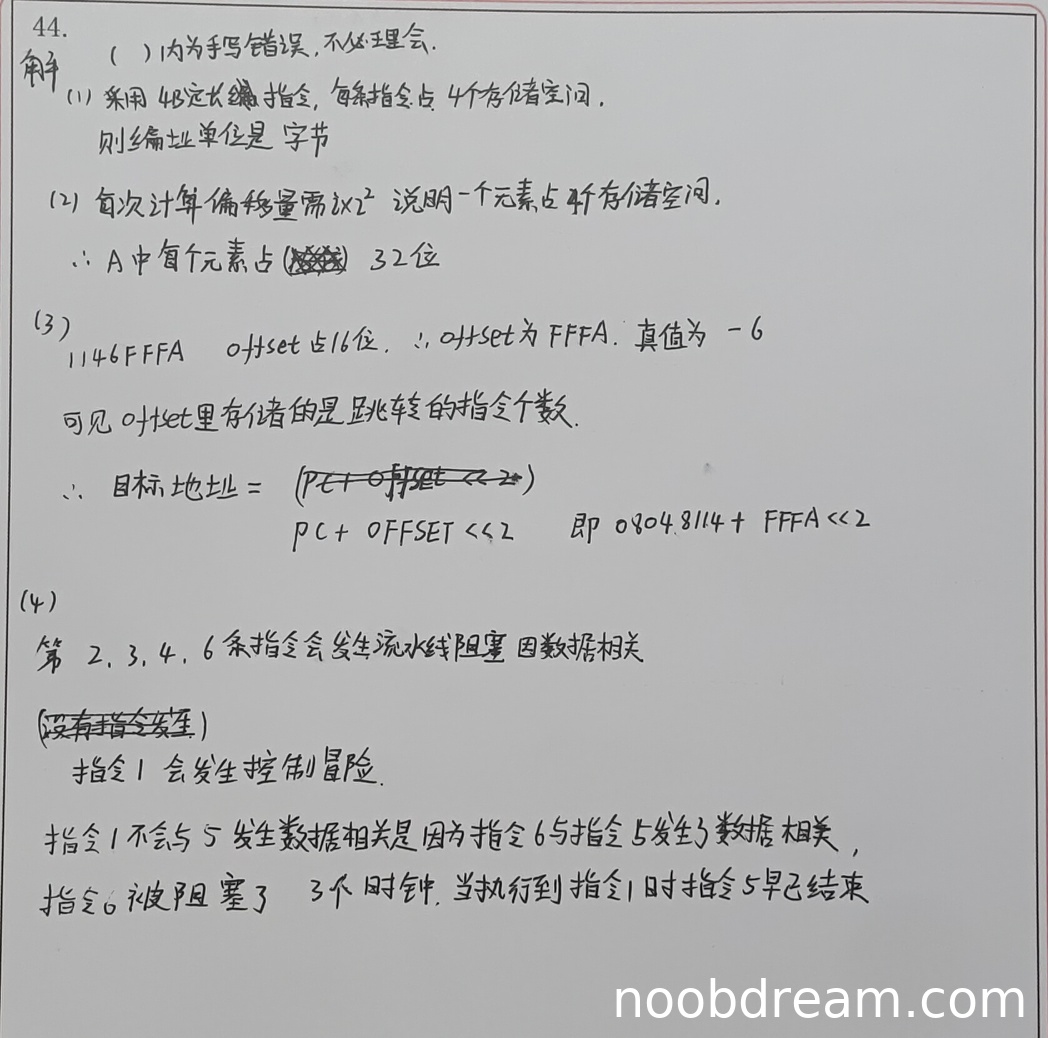 学生正确指出第2、3、4、6条指令因数据相关发生阻塞,得3分。但控制冒险回答错误:学生称指令1发生控制冒险,实际应为指令6(bne指令)发生控制冒险,扣1分。对于指令1与指令5的数据相关问题,学生解释正确(指令6阻塞使指令5提前完成),得1分。本小题得4分。