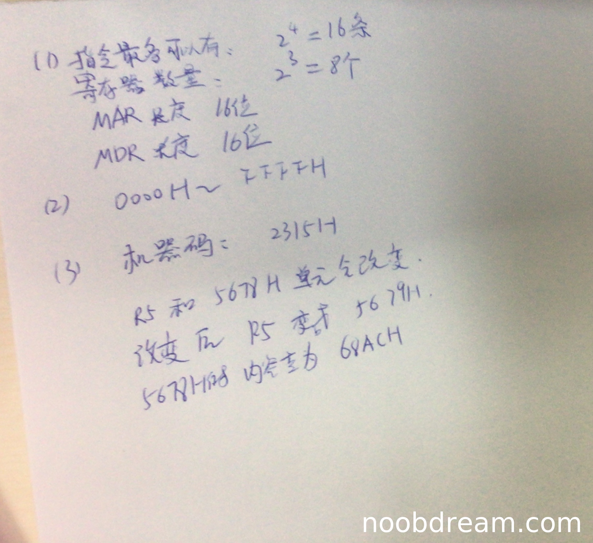 学生答案:指令最多16条,寄存器最多8个,MAR和MDR均为16位。与标准答案完全一致。得4分。