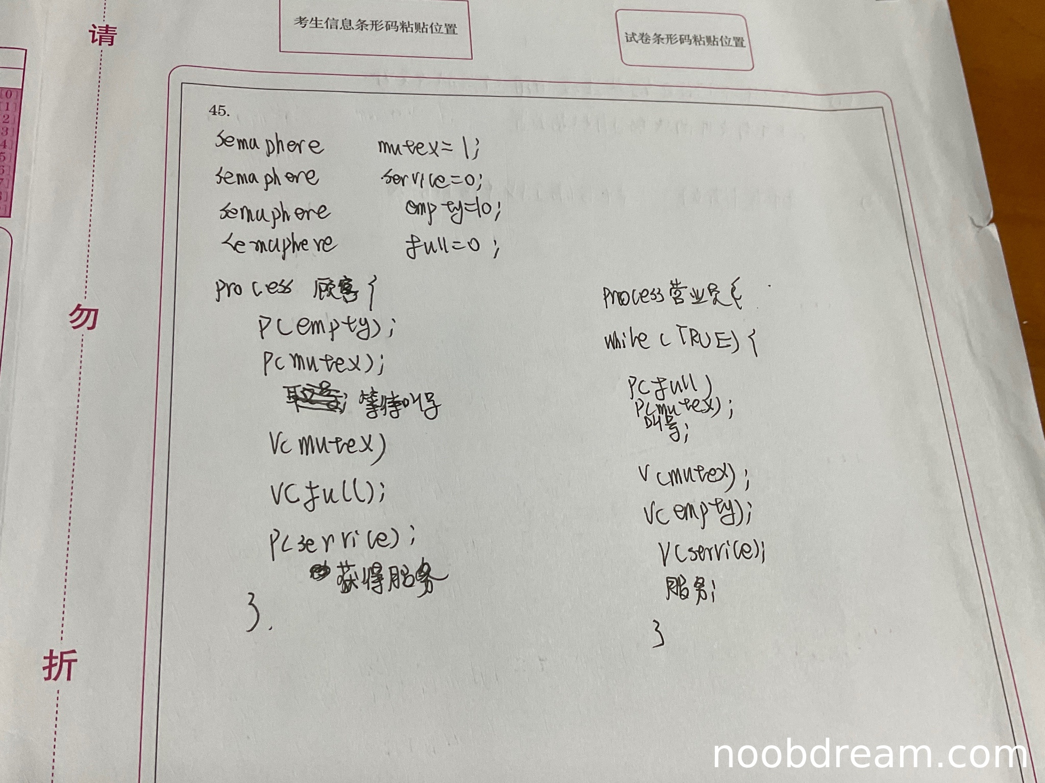 理由:顾客进程基本遵循了生产者-消费者模型的结构,使用了P(empty)、P(mutex)、V(mutex)、V(full)、P(service)等操作,顺序基本正确。但存在以下问题:①缺少对取号机的互斥访问(P(machine)/V(machine)),扣1分;②没有体现"从取号机获得一个号码"的具体操作,扣1分。
