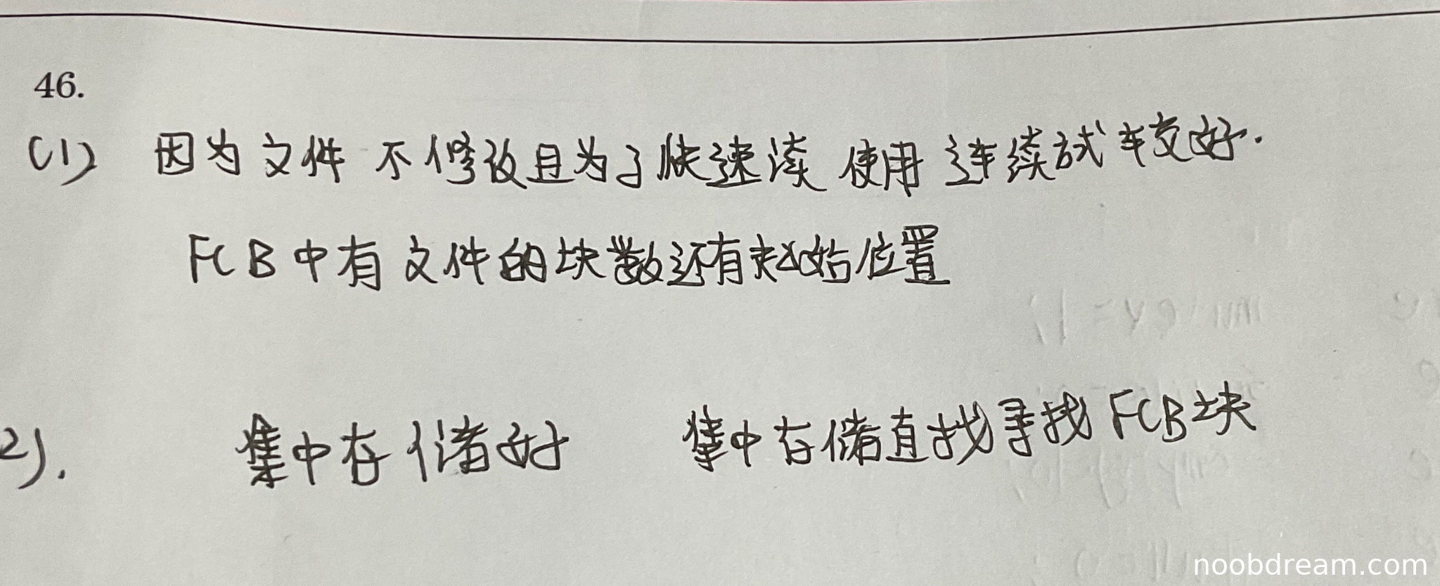 学生答案:第一问正确选择了“连续式”,理由“文件不修改且为了快速读”与标准答案中“一次写入不存在扩展问题”和“读取速度最快”的核心逻辑一致。第二问正确指出了FCB中需要“文件的块数还有起始位置”,即标准答案中的“起始块号和块数”。答案完整且逻辑正确。