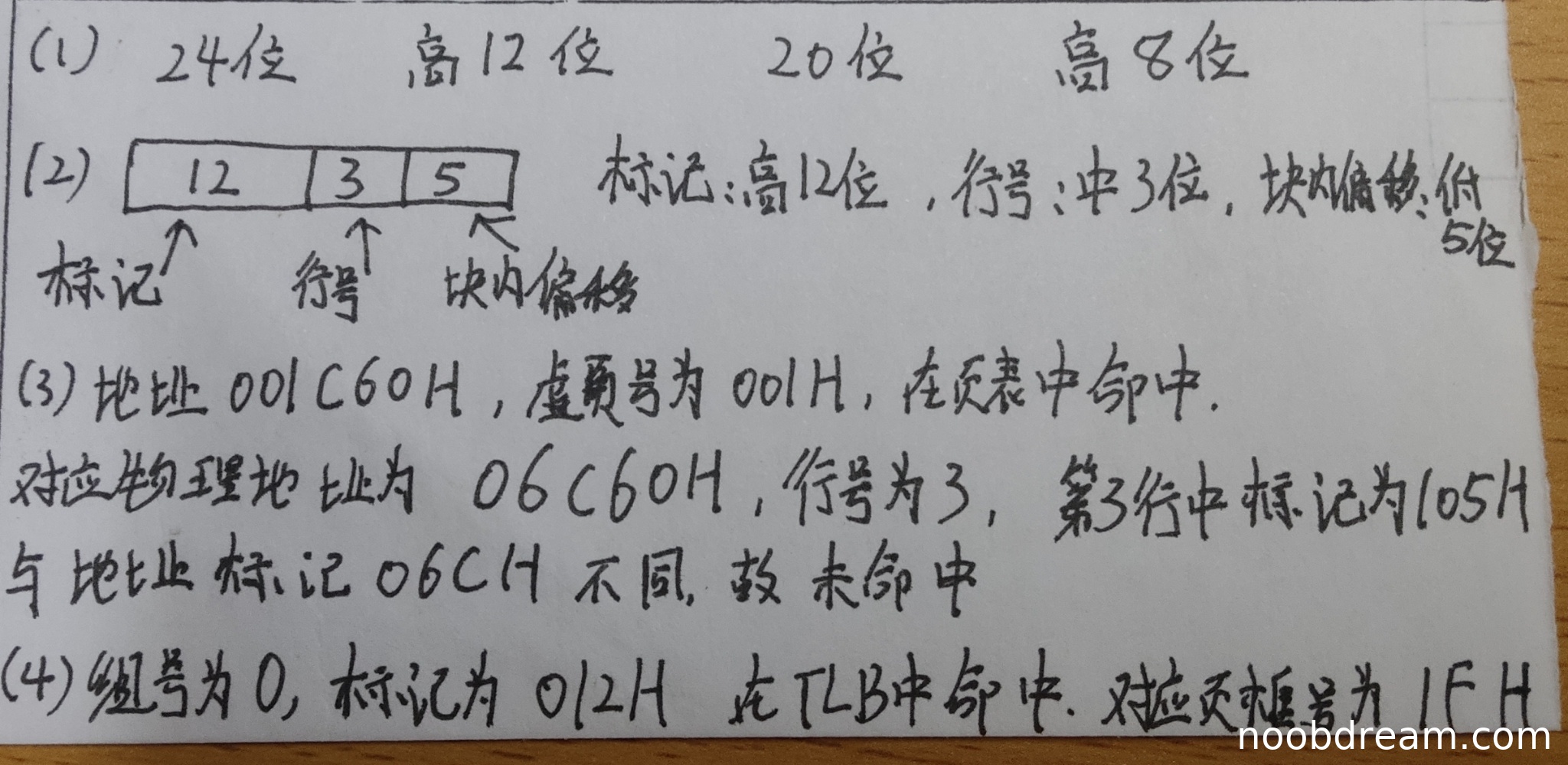 学生答案正确指出虚拟地址为24位,虚页号为高12位;物理地址为20位,页框号为高8位。与标准答案完全一致。得4分。