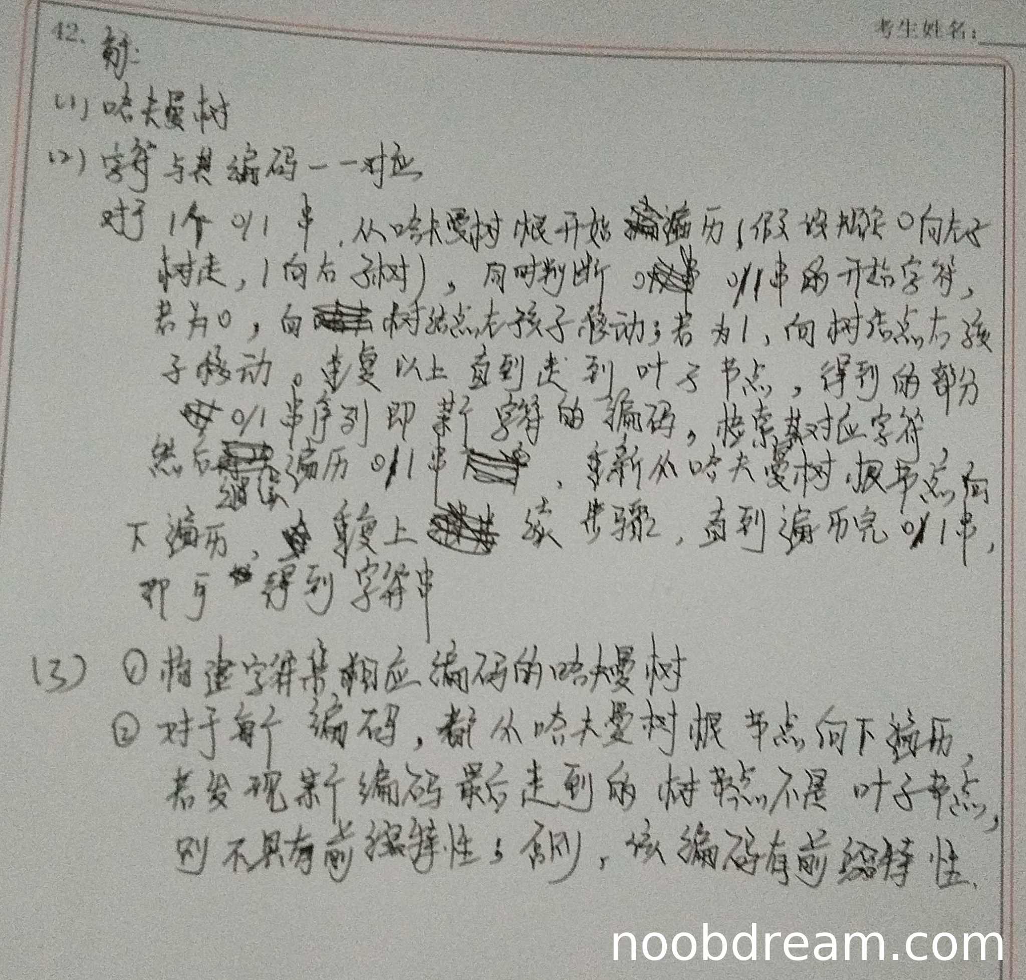 学生提出构建哈夫曼树,并检查每个编码对应的终点是否为叶子节点,若存在非叶子节点终点则不具有前缀特性。该思路正确,与标准答案“字符信息只能存在叶结点中”一致。但学生未明确说明“若构造过程中出现冲突(如某个编码路径已被占用)也不具有前缀特性”,不过核心判定逻辑已给出,可视为基本正确,得3分。