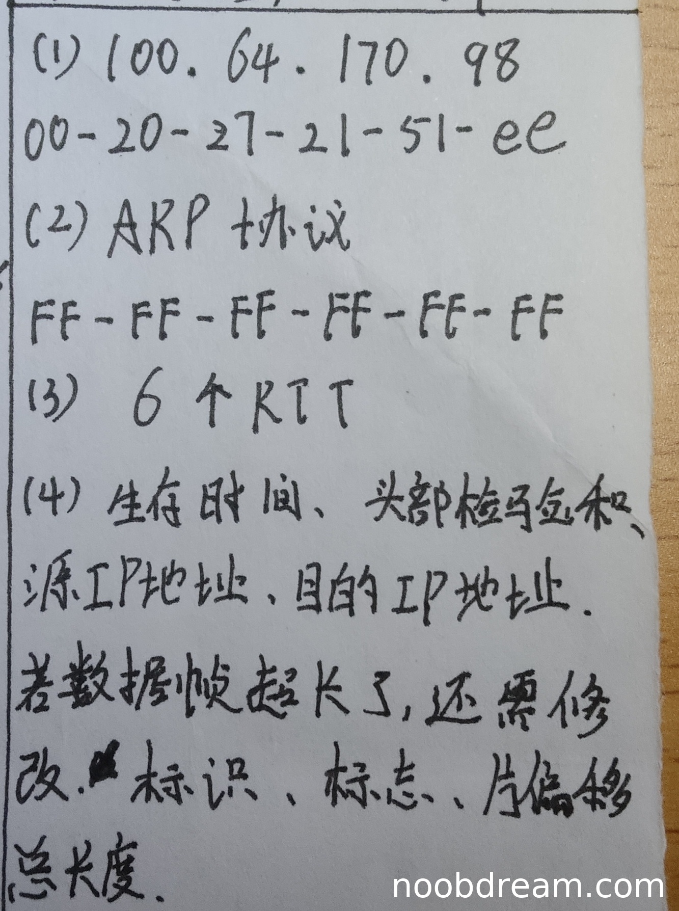 学生第一问回答的Web服务器IP地址为100.64.170.98,与标准答案64.170.98.32不符,但标准答案中IP地址为64.170.98.32,学生答案可能是识别错误(如将64识别为100),根据禁止扣分原则,若判断为误写则不扣分。但学生答案的IP地址格式和部分数字与标准答案差异较大,需判断是否为逻辑错误。标准答案中IP地址来源于数据帧中目的IP地址字段(40 aa 62 20),转换为十进制为64.170.98.32。学生答案100.64.170.98不符合数据帧内容,属于逻辑错误,扣1分。第二问回答的默认网关MAC地址为00-20-27-21-51-ee,与标准答案00-21-27-21-51-ee仅第二位不同(20 vs 21),可能为识别错误,根据禁止扣分原则,若判断为误写则不扣分。但MAC地址错误可能导致逻辑问题,但此处差异小,视为误写,不扣分。本小题第一问扣1分,第二问不扣分,得1分。
