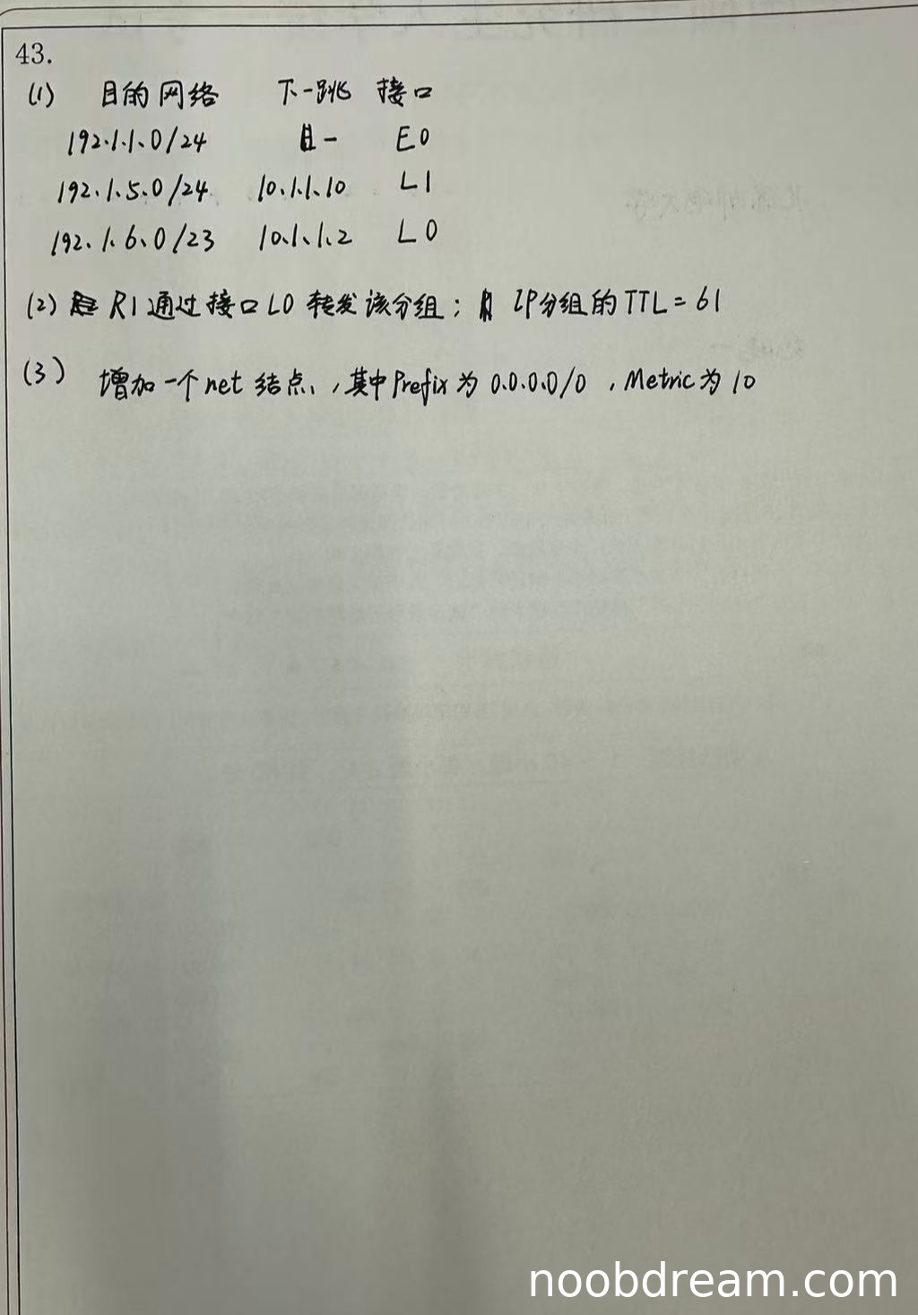 学生答案正确指出R1通过接口L0转发该IP分组。同时,正确计算出IP分组经过3个路由器(R1、R2、R4),TTL从64减少到61。答案与标准答案完全一致。因此,本小题得2分。