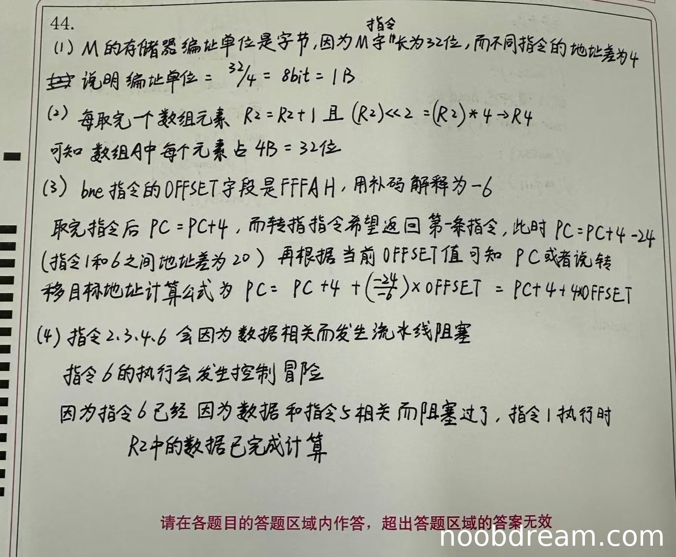 学生答案正确指出OFFSET字段值为FFFAH(补码表示为-6),得1分。转移目标地址计算公式部分,学生给出公式为PC = PC + 4 + 4×OFFSET,与标准答案(PC)+4+OFFSET×4一致,但学生在推导过程中提到“指令1和6之间地址差为20”(实际应为24,即18H),此处存在计算错误,但公式结果正确,可能为误写。根据禁止扣分原则,不扣分。得3分。