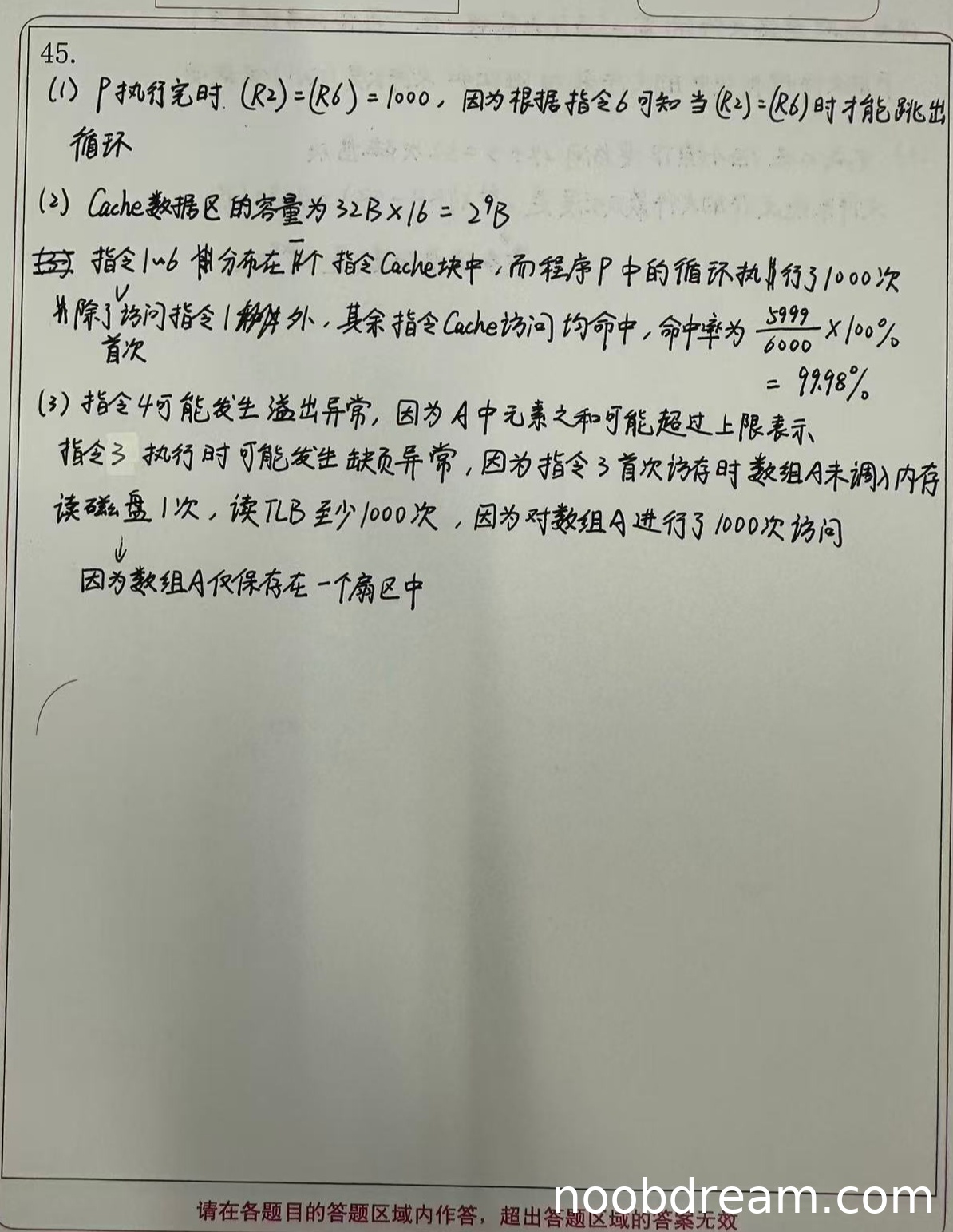 第二问(缺页异常指令):学生正确指出指令3可能发生缺页异常,理由正确。得1分。