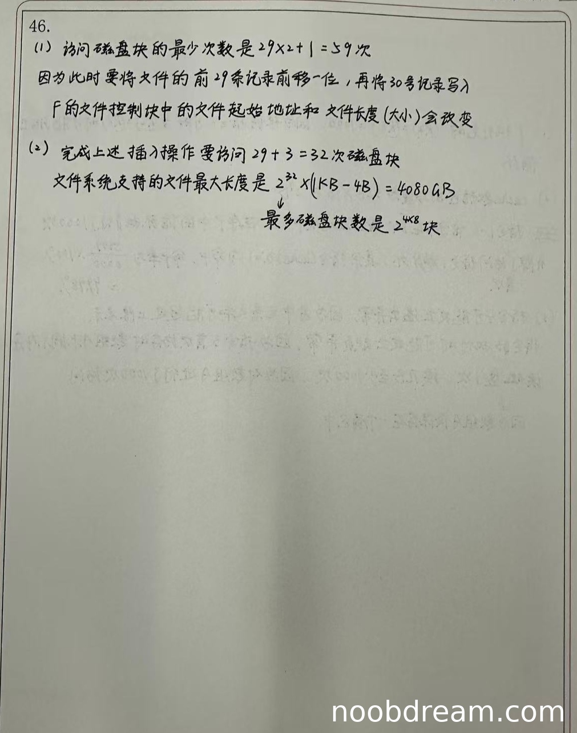 学生答案中计算访问磁盘块次数为29 + 3 = 32次,但标准答案为31次(找到第29块需要29次,写入新块1次,更新第29块1次)。这里存在逻辑错误,多算了1次访盘,扣1分。
