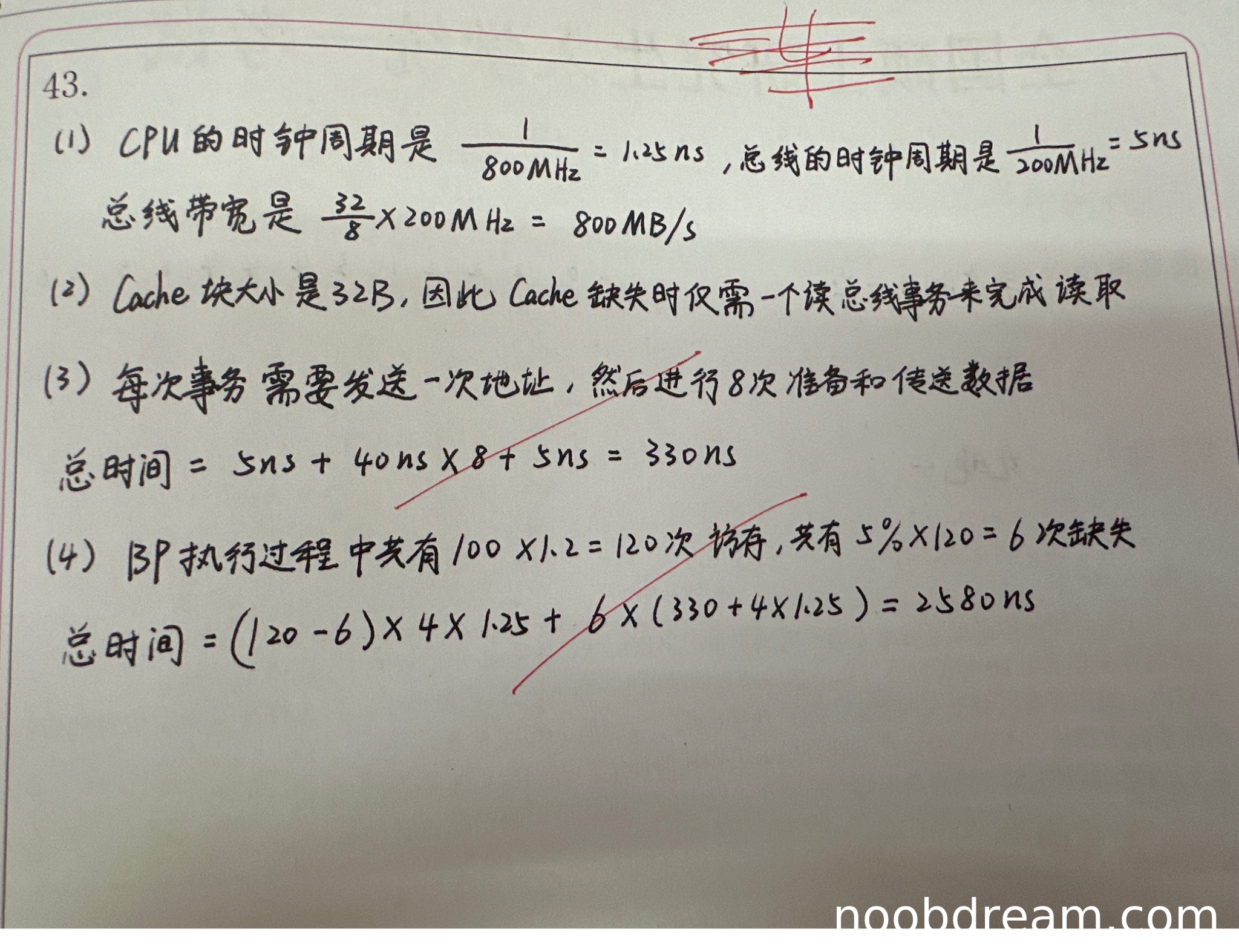 学生正确计算了CPU时钟周期(1.25ns)和总线时钟周期(5ns),各得0.5分。总线带宽计算正确(800MB/s),得1分。但学生计算带宽时写的是“32/8×200MHz”,其中“32/8”可能是误写(应为32位/8=4字节),但结果正确,不扣分。本题得3分。