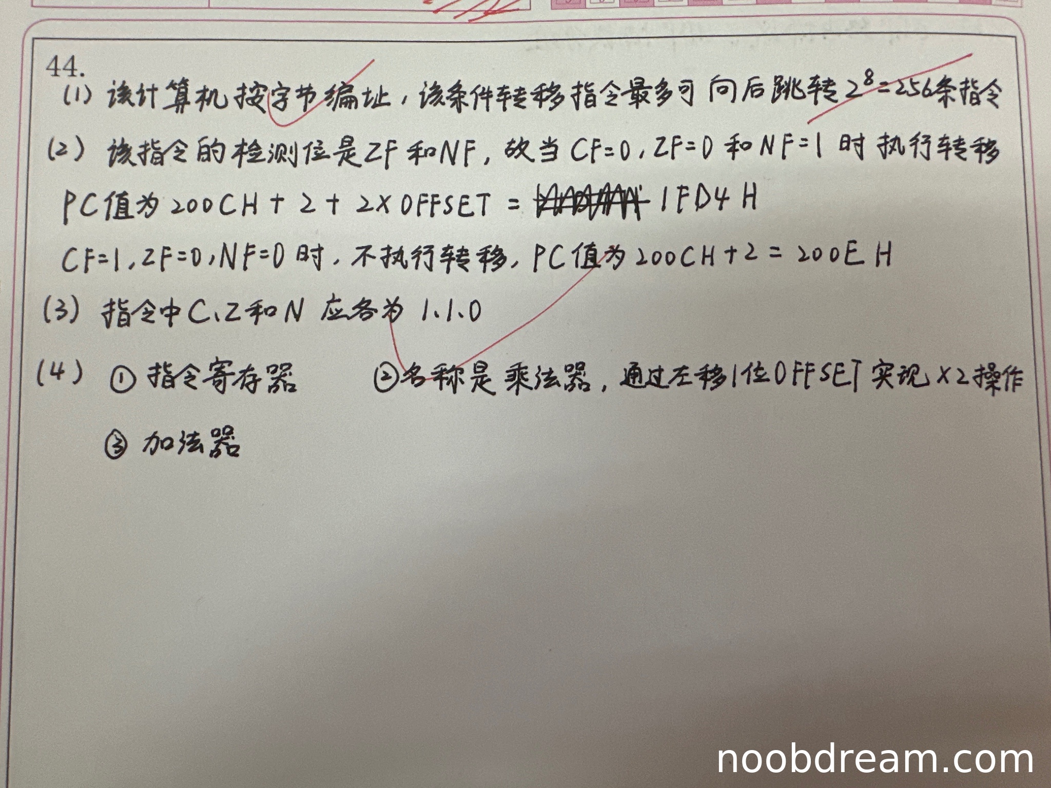 学生回答“按字节编址”正确,得1分。但回答“最多可向后跳转2⁸ = 256条指令”错误,因为偏移量OFFSET是8位补码,范围为-128~127,向后最多跳转127条指令。学生未考虑补码范围,逻辑错误,扣2分。本题得1分。