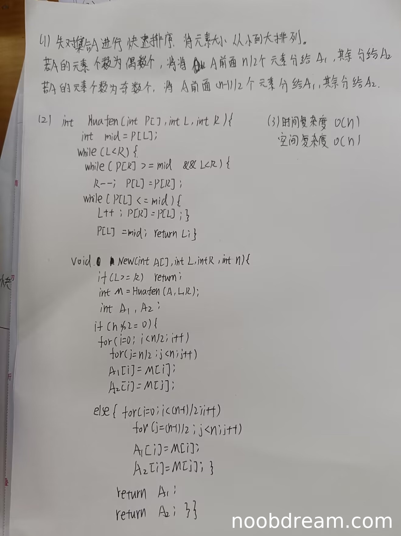 理由:学生给出的时间复杂度O(n)和空间复杂度O(n)分析错误。基于快速排序的方法时间复杂度应为O(nlog₂n),空间复杂度应为O(log₂n)(递归栈空间)。分析完全错误,扣2分。