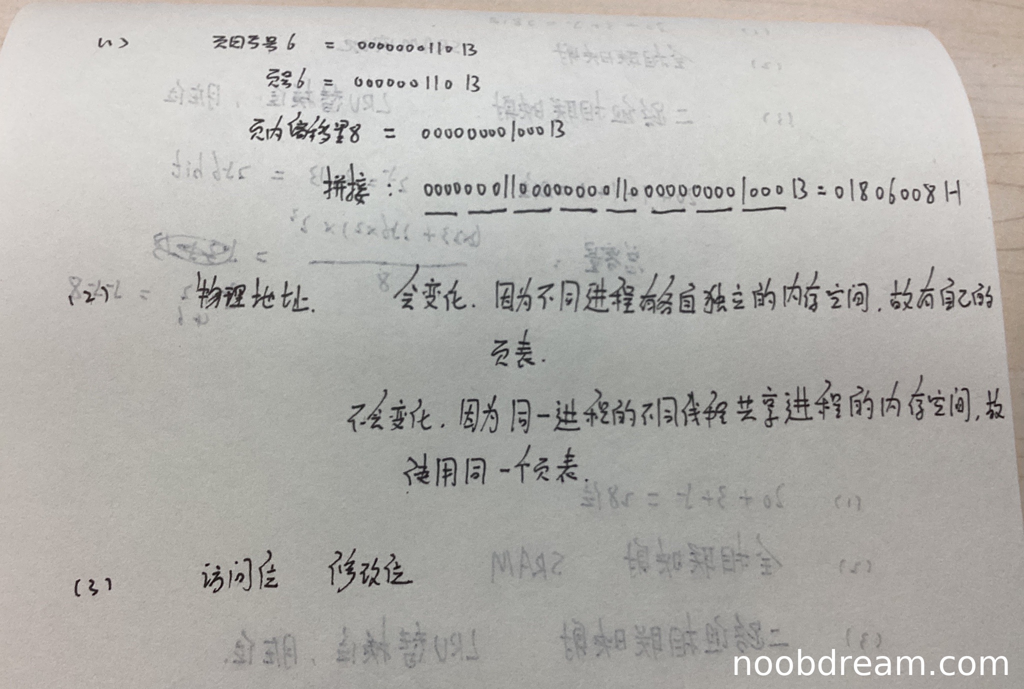 学生第一次识别结果中,最终答案“01806008 1H”存在格式错误(多了一个“1”),但核心计算过程“00000001100000000110000000001000”和“01806008”是正确的。第二次识别结果中,计算过程存在笔误(第二个页号写成了“000000110B”,少了一位),但最终答案“01806008H”正确。考虑到识别误差和核心答案正确,扣0.5分。得1.5分。