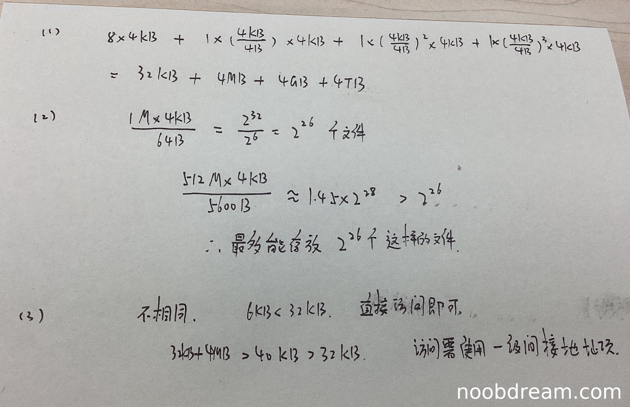 学生答案给出了正确的计算表达式,包括直接地址项、一级、二级和三级间接地址项的计算,最终结果也与标准答案一致。虽然表达式中的“4kB”在标准答案中为“4KB”,但这是单位书写习惯问题,不影响逻辑。因此得2分。