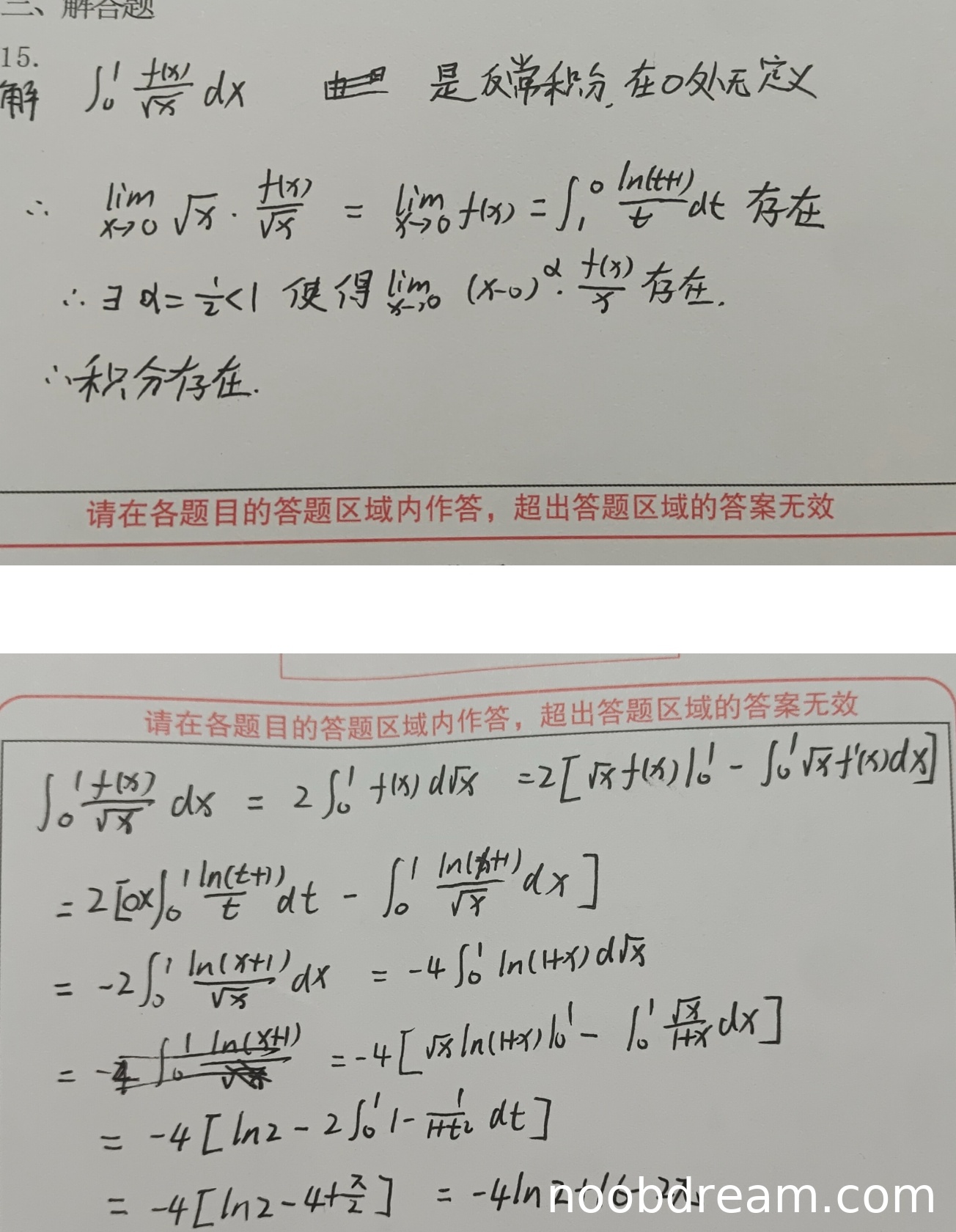 学生的第一次识别结果在最后一步计算\( \int_{0}^{1} \frac{1}{1+t} dt \)时出现逻辑错误,导致最终答案错误。但根据打分要求第3条“为了提高准确度,对学生作答进行了两次识别,只要其中有一次回答正确则不扣分”,且第二次识别结果完全正确,故本部分不扣分,得满分10分。