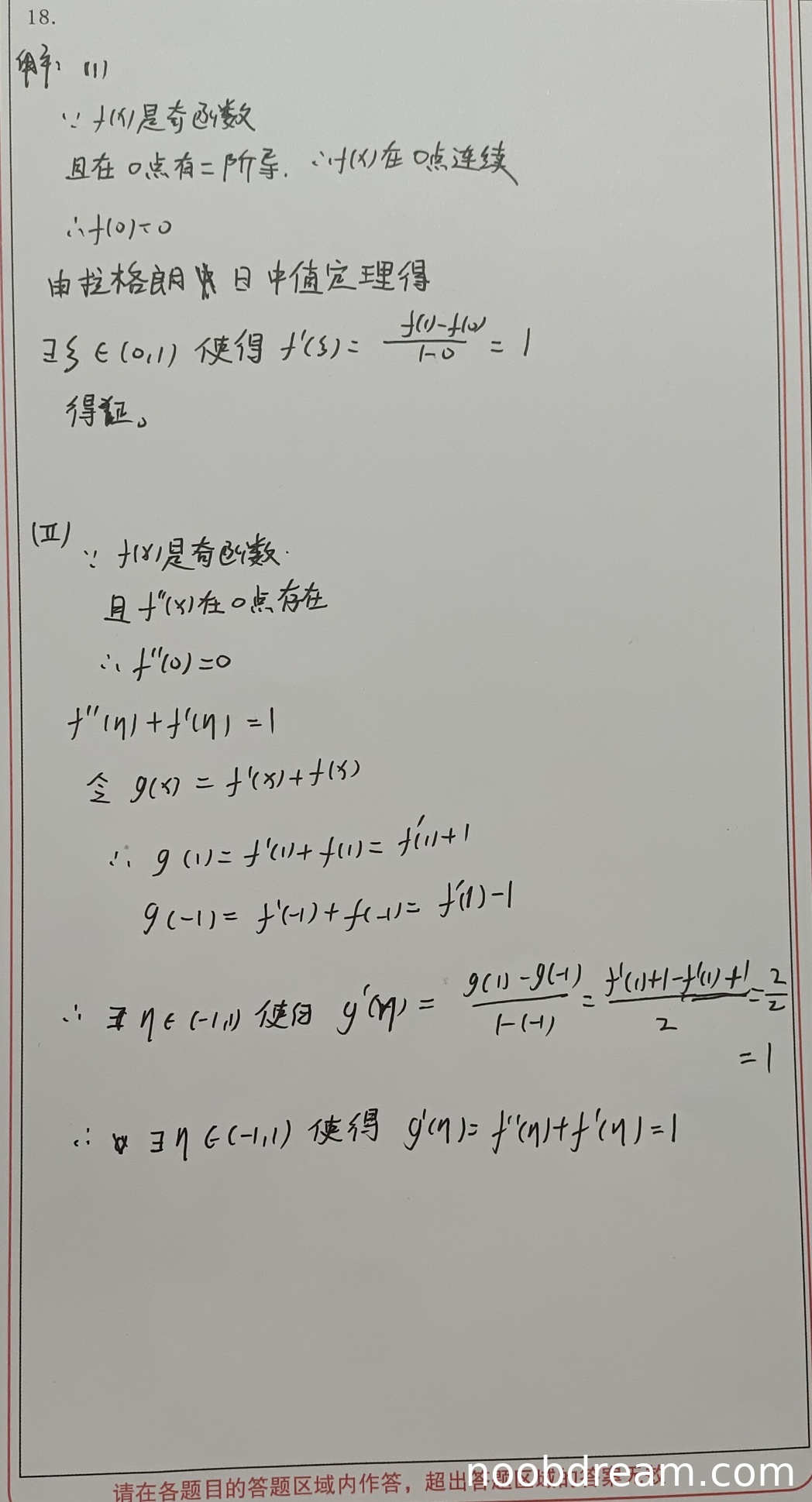第(II)问:学生的证明存在严重逻辑错误。首先,由f(x)是奇函数且二阶可导,并不能直接推出f''(0)=0(虽然结论正确,但推理不严谨)。其次,学生定义g(x)=f'(x)+f(x),然后计算g(1)和g(-1),并试图对g(x)在区间[-1,1]上应用中值定理。然而,g(x)在x=-1和x=1处的函数值依赖于未知的f'(1),学生错误地认为g(1)-g(-1)=2,这是不成立的,因为f'(-1)作为偶函数在-1的值应等于f'(1),所以g(-1)=f'(-1)+f(-1)=f'(1)-1,g(1)-g(-1)=[f'(1)+1]-[f'(1)-1]=2,这个计算本身正确。但是,要应用中值定理,需要g(x)在[-1,1]上连续,在(-1,1)内可导。学生没有验证g(x)在端点x=-1和x=1处的连续性或可导性(实际上,题目只给出f(x)在[-1,1]上具有二阶导数,意味着f'(x)在[-1,1]上连续,故g(x)在[-1,1]上连续;且f''(x)在(-1,1)存在,故g'(x)在(-1,1)存在。因此中值定理条件满足)。然而,最关键的错误在于,中值定理得到的是存在η∈(-1,1)使得g'(η)=[g(1)-g(-1)]/2=1,这确实给出了f''(η)+f'(η)=1。但学生的证明依赖于f'(1)的值,而f'(1)的值题目并未给出,学生假设g(1)-g(-1)=2是成立的,但实际上这个计算是正确的,因为f'(-1)=f'(1)(由奇函数性质,f'(x)是偶函数)。因此,学生的证明在计算g(1)-g(-1)时是正确的,且中值定理应用条件实际上满足(虽未明确说明),但证明过程不严谨,且没有利用第(I)问的结论(标准答案利用了f'(ξ)=1和对称性)。考虑到证明的核心步骤(定义g(x)并应用中值定理)思路正确,但推理不够严密,且与标准答案方法不同,扣1分。因此,第(II)问得4分。