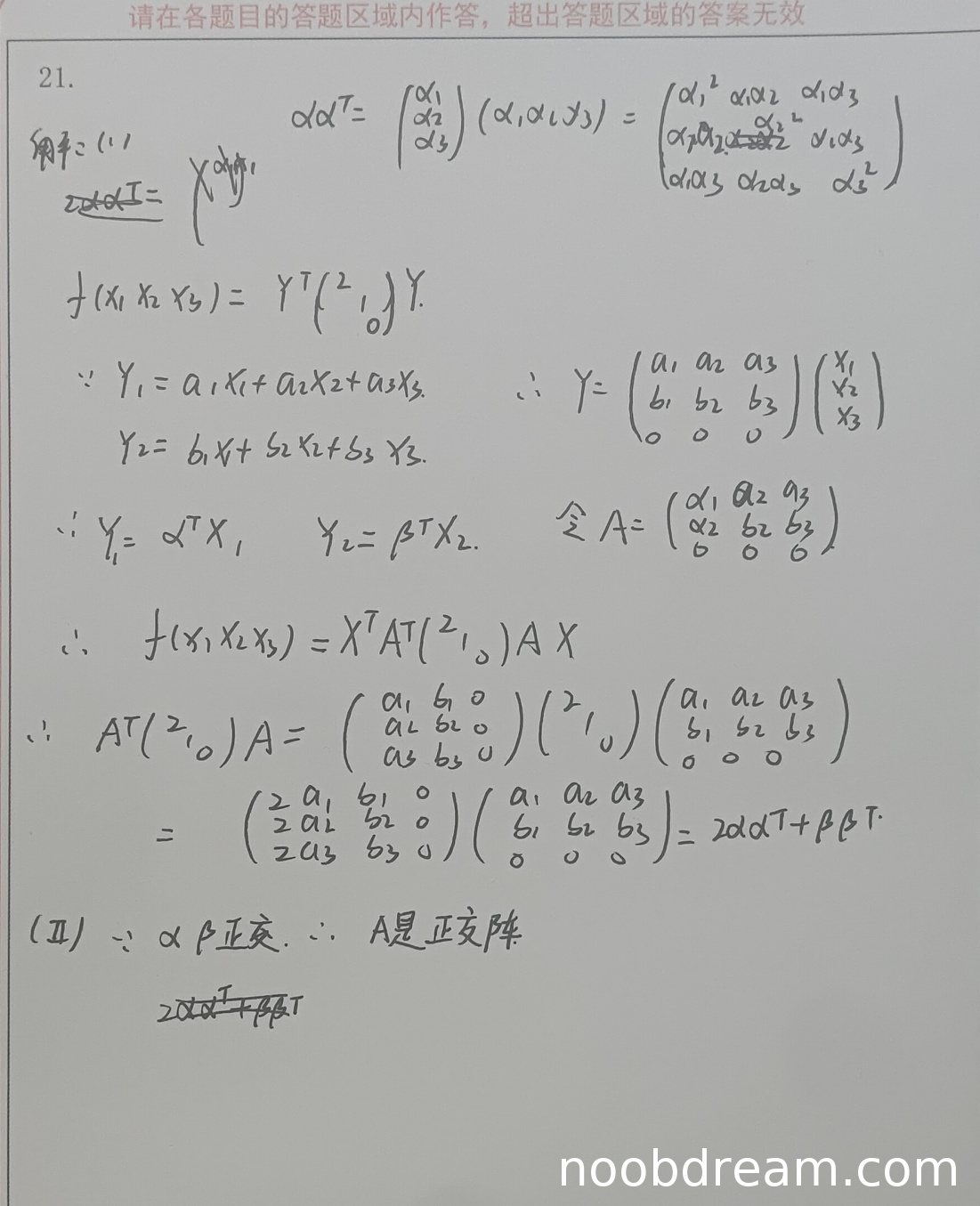 学生作答中,第1次识别结果在(I)部分存在逻辑错误:定义Y时错误地引入了第三行全零,导致矩阵A的构造错误(A应为2×3矩阵,但学生写成了3×3矩阵且第三行为零),后续计算A^T diag(2,1) A时维度不匹配,虽然最终结果写对了2αα^T+ββ^T,但推导过程存在根本性逻辑错误。第2次识别结果纠正了部分错误,明确了Y与X的关系,但矩阵A的构造仍不一致(第二行写错为a₂,b₂,b₃),且计算过程中出现“2a₁,2a₂,0”等明显错误。由于核心思路(通过线性变换将f表示为Y^T diag(2,1)Y再转换回X)正确,但具体执行存在多处逻辑错误,扣3分。得分:5.5-3=2.5分。