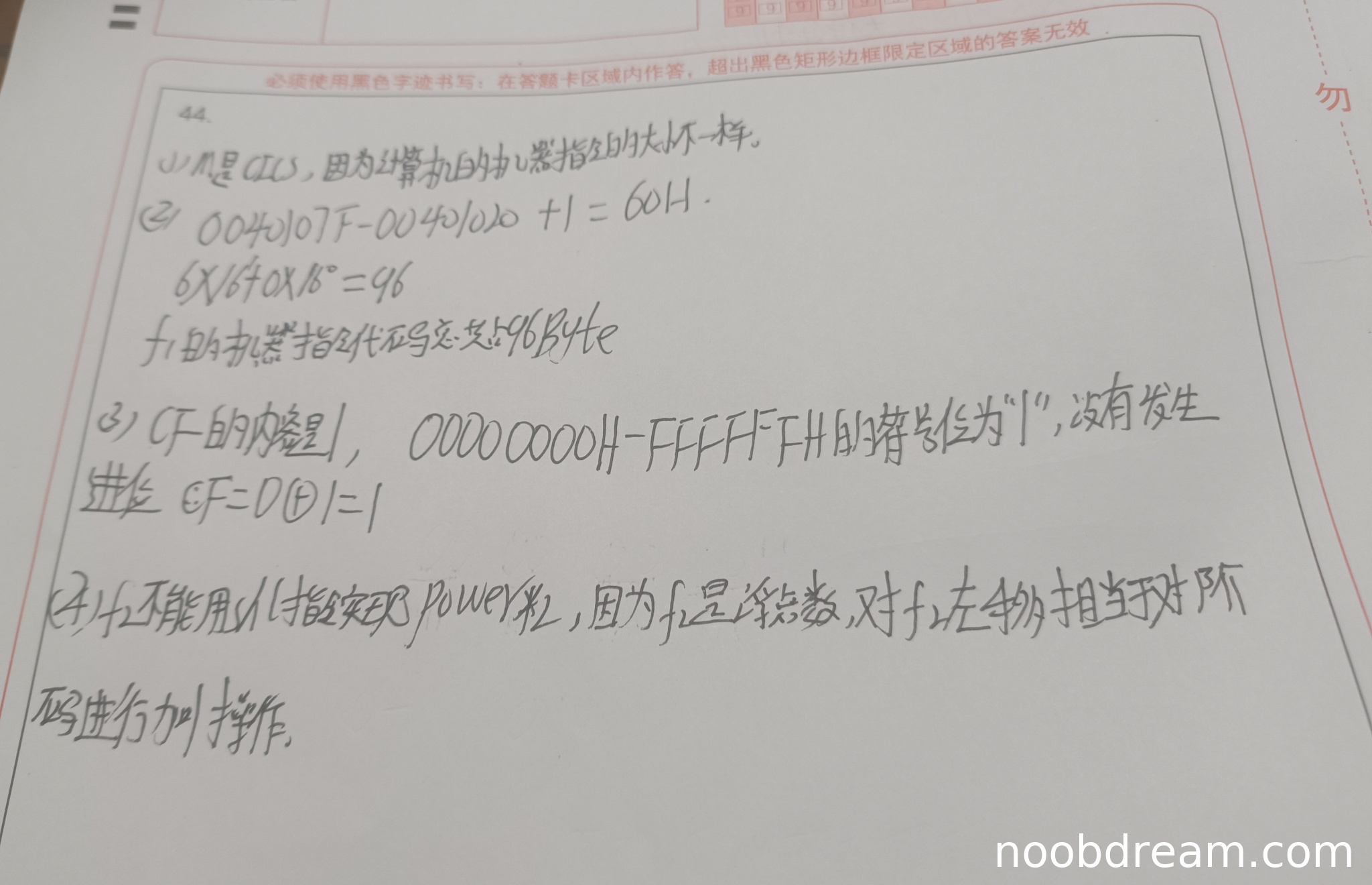 学生答案:两次识别均给出CF=1,且第2次识别给出了部分正确推导(CF=0⊕1=1)。但第1次识别中“符号位为1”表述不严谨(CF与符号位无直接关系),第2次识别中“没有发生进位”表述不准确(减法运算应讨论借位)。标准答案强调补码减法中CF=C⊕1(C为加法器进位输出),学生答案核心结论正确但过程不完整。扣1分,得2分。