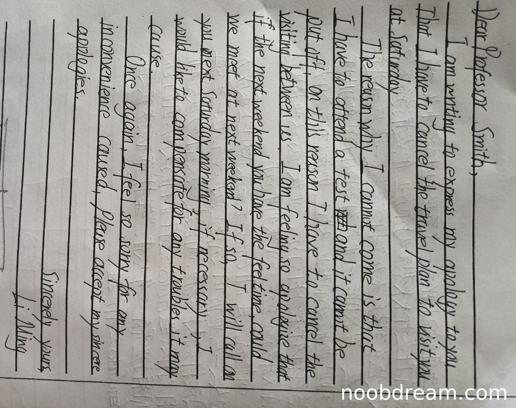 格式与语域: 第二次识别的格式正确,包含了称呼(Dear Professor Smith)、正文、结束语(Sincerely yours)和签名(Li Ming)。语域整体恰当,使用了正式的书信语言,如“I am writing to express my apology”, “Please accept my sincere apologies”。第一次识别缺少称呼,格式不完整。综合两次识别结果,格式基本正确,语域较为恰当,符合第四档要求。