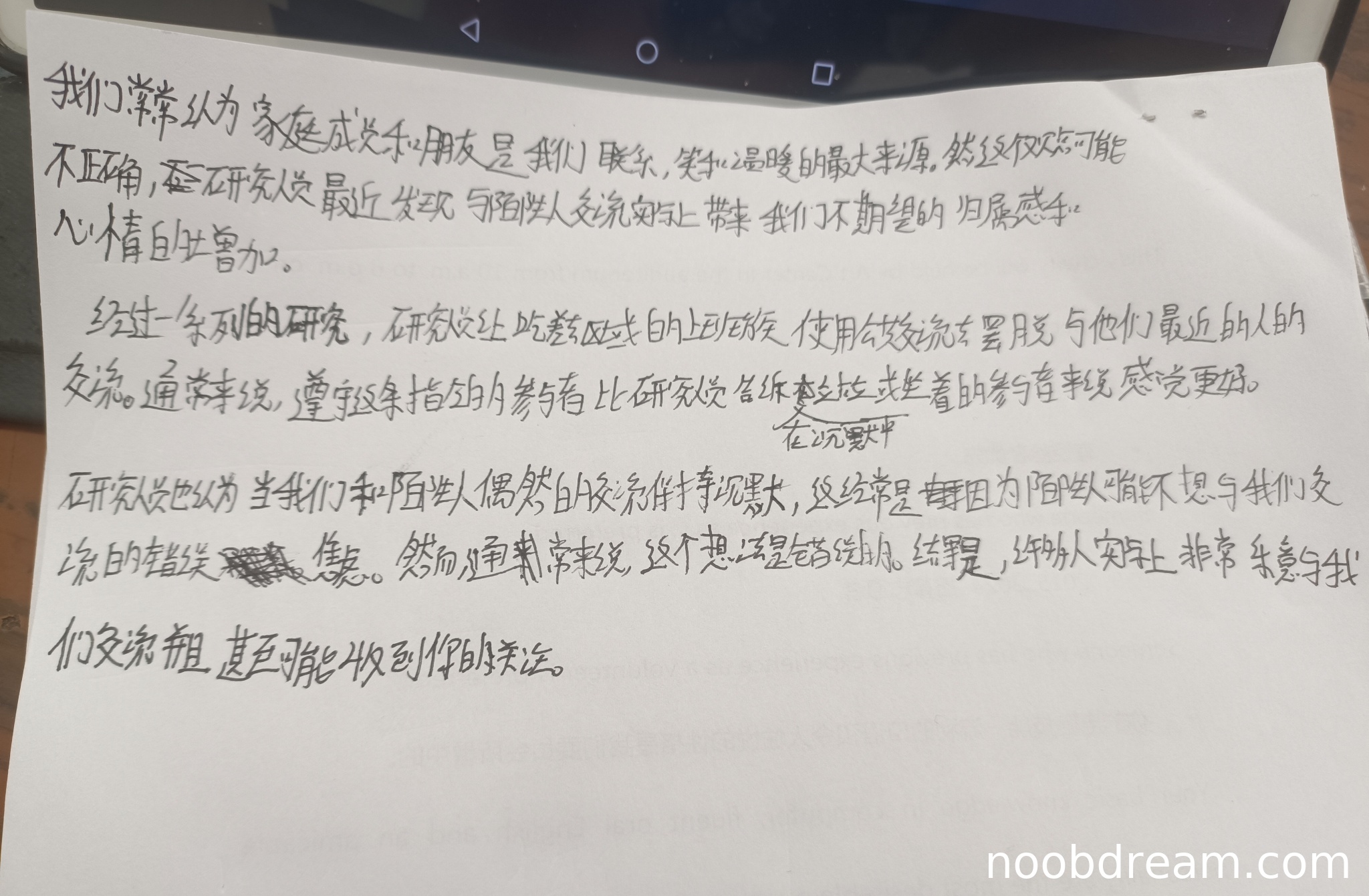 但核心逻辑(朋友家人是主要情感来源,但陌生人交流有意想不到的好处)表述完整。