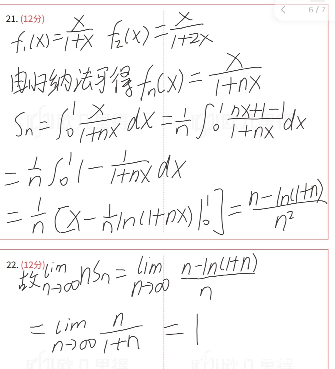 学生正确写出 \(S_n = \int_0^1 f_n(x) dx = \int_0^1 \frac{x}{1+nx} dx\),并通过变形 \(\frac{x}{1+nx} = \frac{1}{n} \left(1 - \frac{1}{1+nx}\right)\) 进行积分计算。积分过程正确,得到 \(S_n = \frac{n - \ln(1+n)}{n^2}\),与标准答案等价(标准答案为 \(\frac{1}{n} \left(1 - \frac{\ln(1+n)}{n}\right)\),两者相同)。得 6 分。