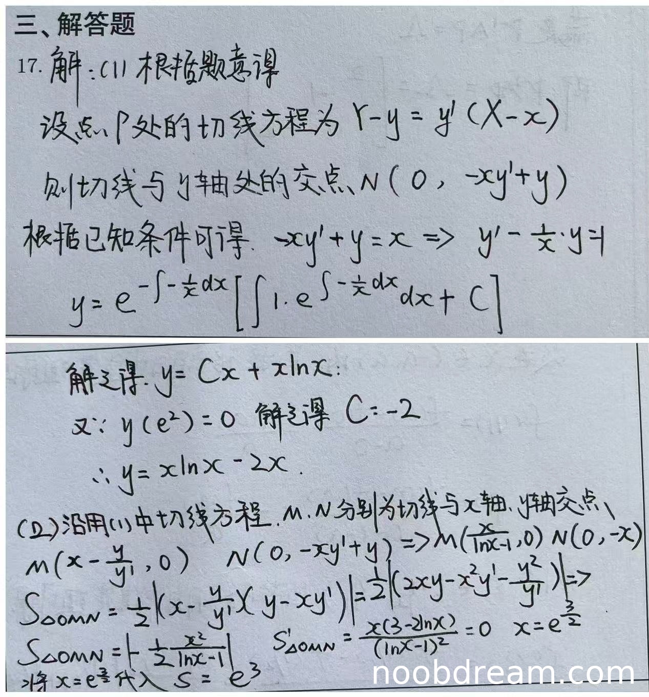 学生在第(2)问中,虽然基于错误的y(x)表达式进行计算,但解题思路正确:正确求出了切线与坐标轴的交点,建立了面积函数,求导找极值点。面积表达式S = 1/2 · |x²/(ln x - 1)|正确(基于其y(x)),求导过程正确,极值点计算正确。由于第(1)问的错误导致本问基础数据错误,但解题方法完整正确,扣2分,得3分。