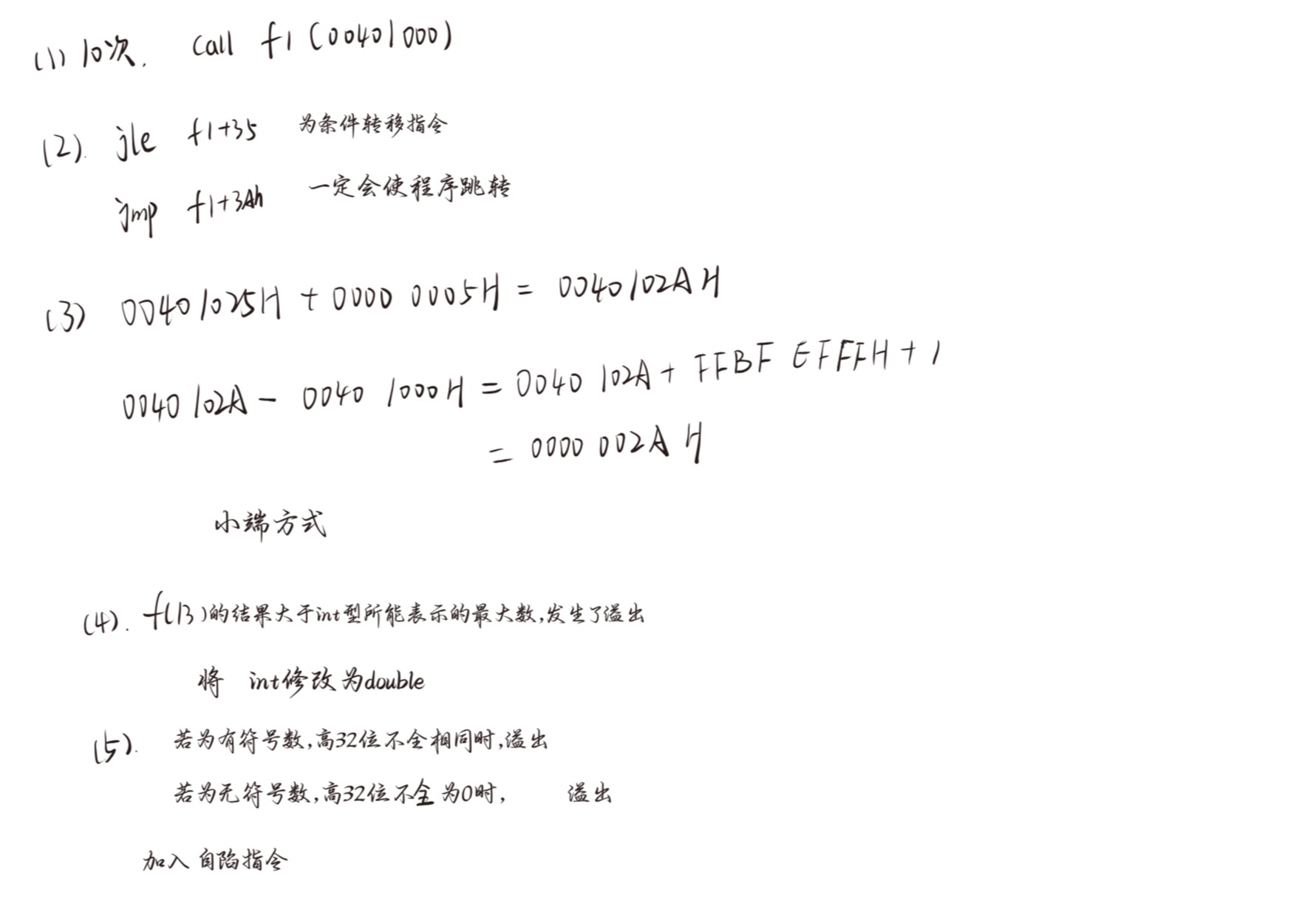 第二问:学生回答“jmp f1+3Ah一定会使程序跳转”,正确,但遗漏了call和ret指令。标准答案要求指出三条指令(call、jmp、ret),学生只答出一条,扣1分。
