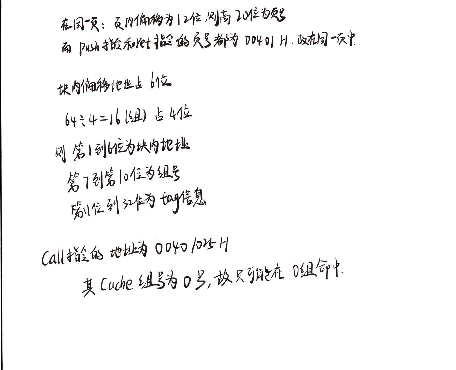 第五问:学生正确指出call指令地址为00401025H(第二次识别正确),并计算出其Cache组号为0,因此只可能在0组命中。理由阐述完整。得2分(此部分标准答案约占2分)。