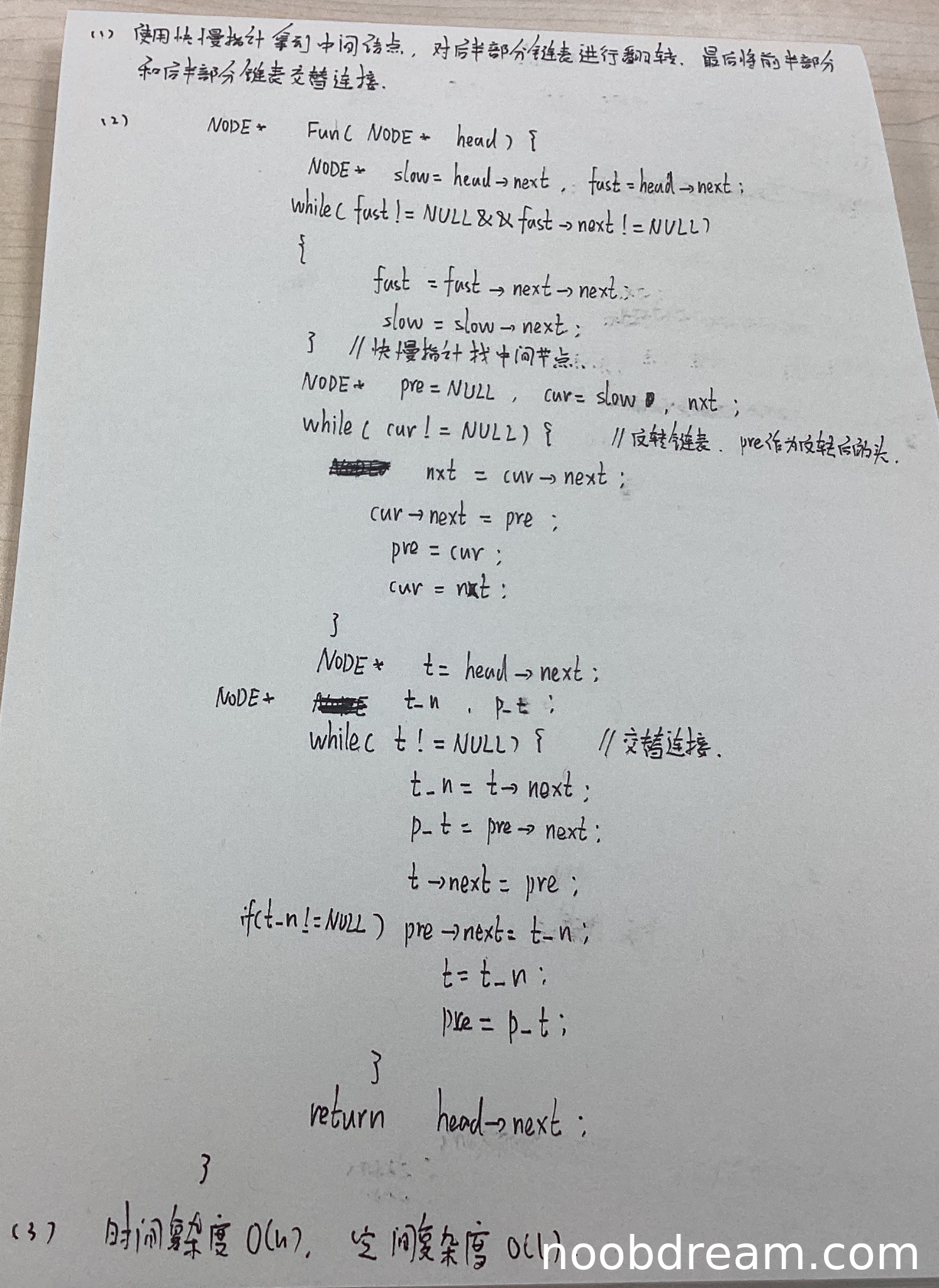 学生作答中给出的基本设计思想与标准答案一致:使用快慢指针找到中间结点,反转后半部分链表,然后交替合并两个部分。思路正确且清晰。得3分。