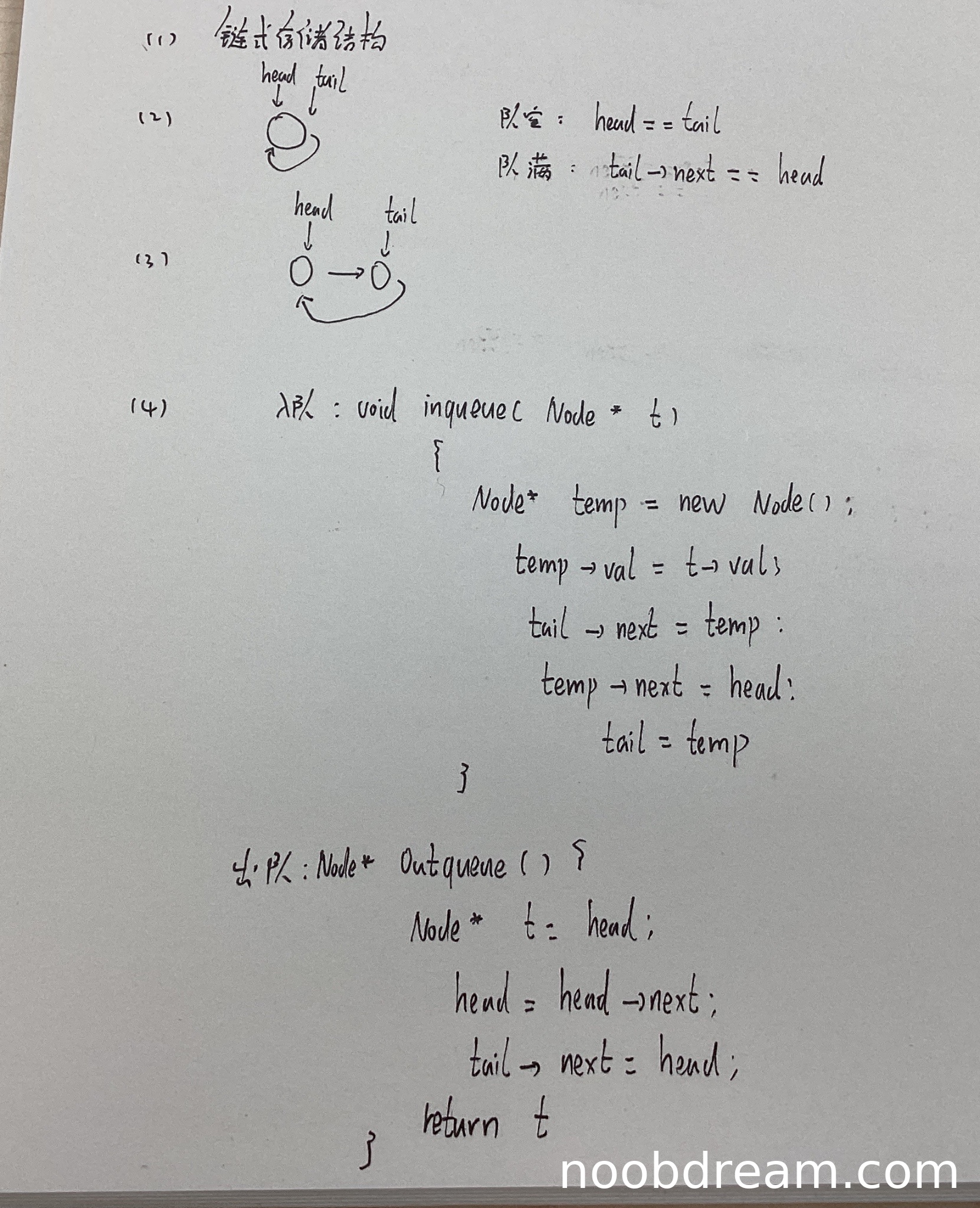 学生的入队操作代码逻辑基本正确,包含了创建新节点、链接新节点、移动尾指针等步骤,但存在以下问题:1. 函数参数设计不合理,入队操作通常传入元素值而非节点指针;2. 未体现标准答案中“先判断队满再申请空间”的严谨逻辑。学生的出队操作代码逻辑基本正确,包含了移动头指针、维护循环链接、返回出队元素等步骤,但存在以下问题:1. 返回的是节点指针而非节点值,与常见队列接口不符;2. 未进行队空判断,存在风险。考虑到核心操作步骤正确,但存在明显逻辑瑕疵,扣1分。本小题得1分。