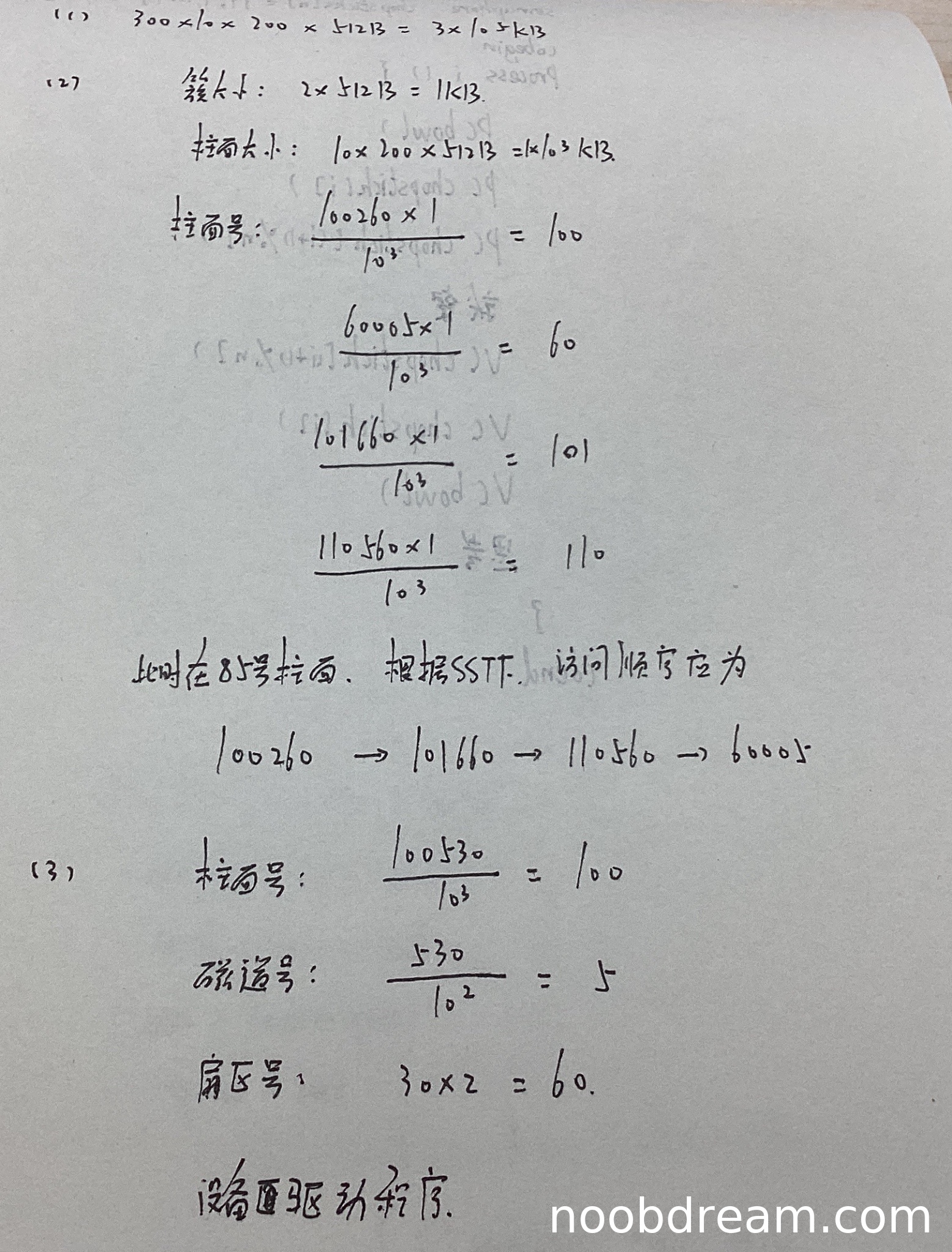 学生正确计算了第100530簇的物理地址:柱面号100、磁道号5、扇区号60,计算过程与标准答案一致。同时,正确指出转换过程由磁盘驱动程序(或设备驱动程序)完成。得3分。