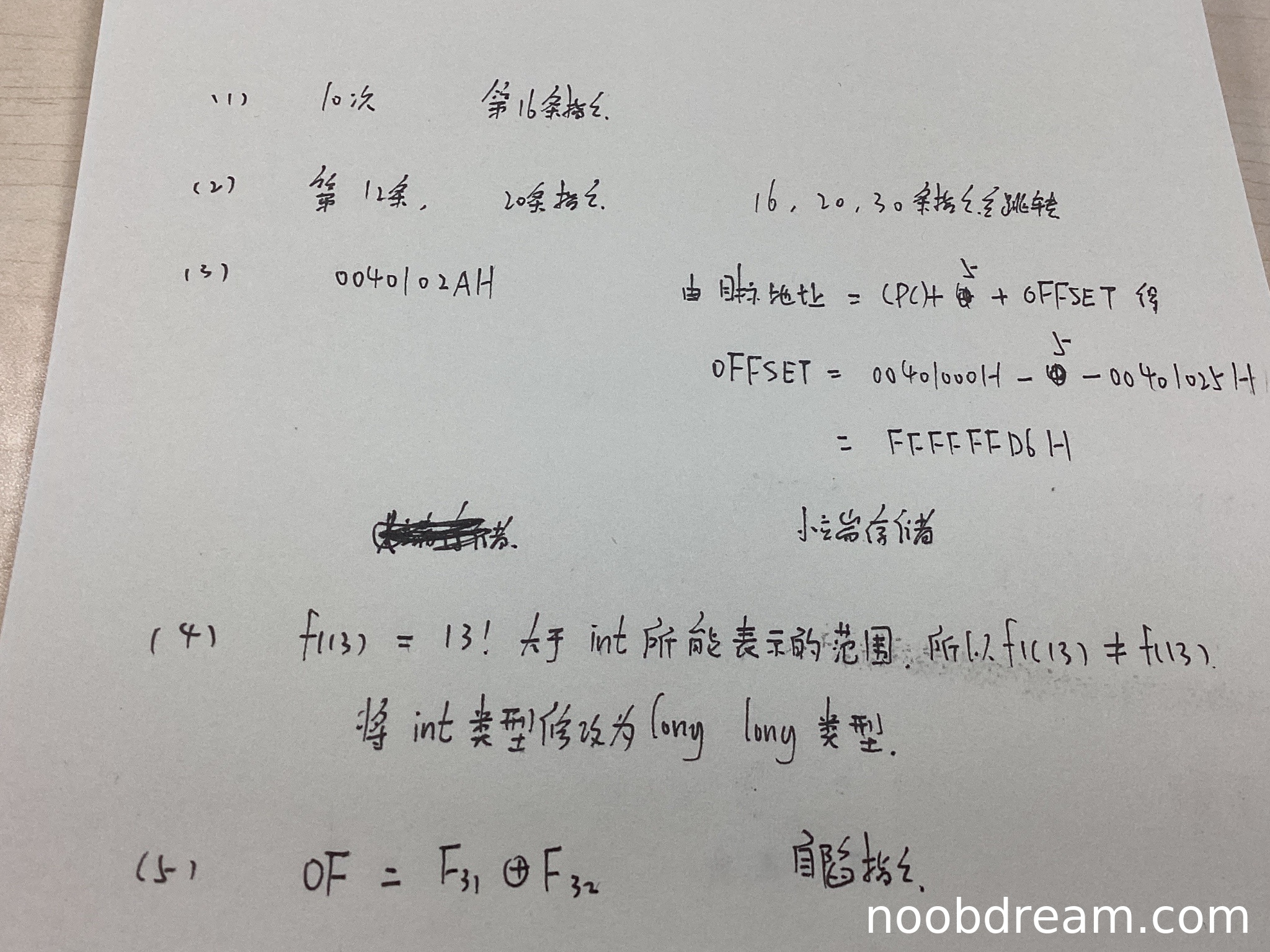 学生答案:溢出条件为OF = F₃₁ ⊕ F₃₂(即高32位的最高位与低32位的最高位异或);应加一条“自陷指令”。