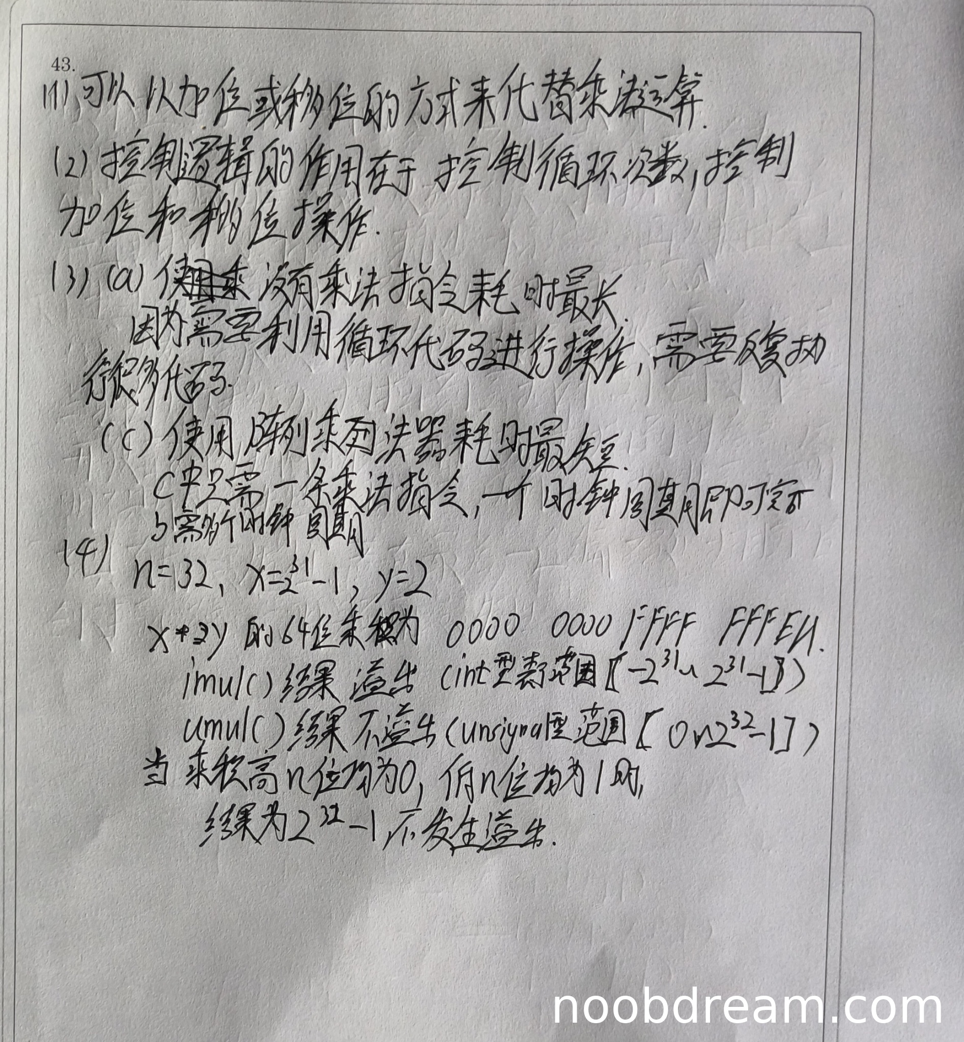 第三问(无符号溢出判断):学生回答“当乘积高n位均为0,低n位为1时,结果为2^32-1,不发生溢出”,逻辑不完整且表述混乱。标准答案要求高n位全0则无溢出,否则溢出;学生仅描述了一种特例(高n位全0且低n位全1),未给出通用规则。扣1分。