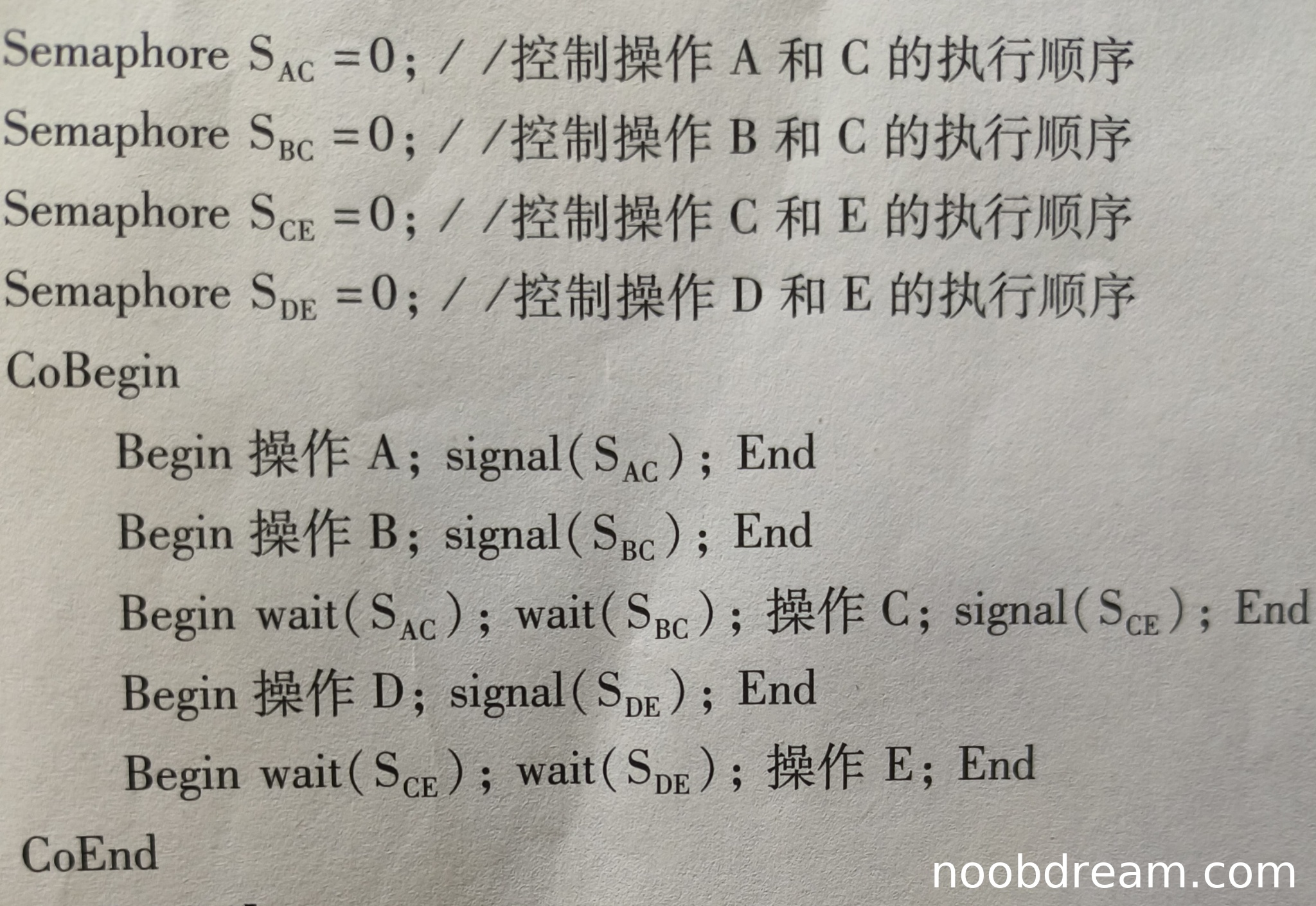 学生答案与标准答案完全一致。信号量定义正确(S_AC、S_BC、S_CE、S_DE初值均为0),各进程(操作)中的wait和signal操作放置位置正确,准确描述了操作C必须在A和B完成后执行、操作E必须在C和D完成后执行的同步关系。因此得满分7分。