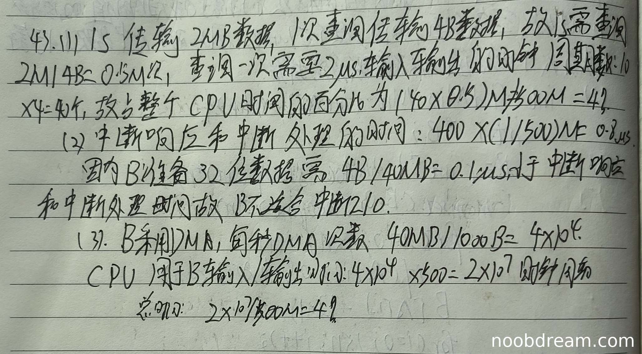 学生正确计算了DMA次数(4×10⁴次)和CPU时间占比(4%),计算过程与标准答案一致。给满分2分。