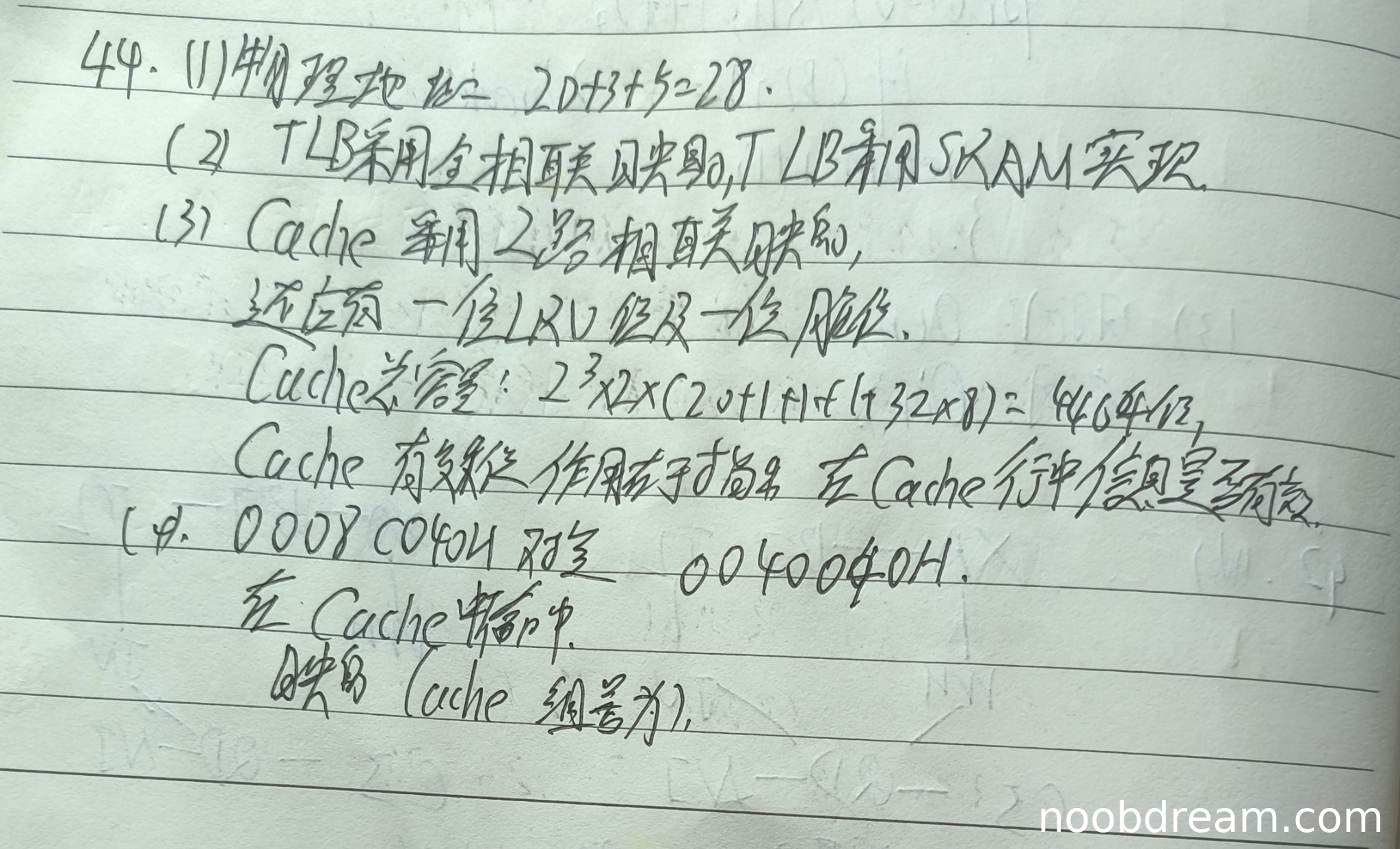 学生正确计算出虚拟地址0008C040H对应的物理地址为0040040H,但在判断是否在Cache中命中时,学生错误地认为命中,而标准答案指出不命中(因为有效位为0或Tag不匹配)。此处存在逻辑错误,扣2分。对于Cache组号的计算,学生未给出具体组号,但标准答案为3,此处未作答扣3分。本小题得0分。