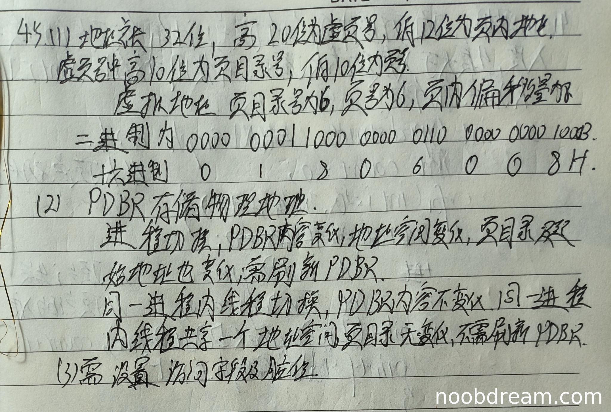 学生正确理解了地址结构:32位地址,高20位为虚页号,低12位为页内地址,且虚页号进一步划分为高10位页目录号和低10位页号。计算过程正确:页目录号6(二进制0000000110)和页号6(二进制0000000110)以及页内偏移8(二进制000000001000)拼接得到二进制地址0000000110 0000000110 000000001000,转换为十六进制为01806008H。两次识别结果均正确。得2分。