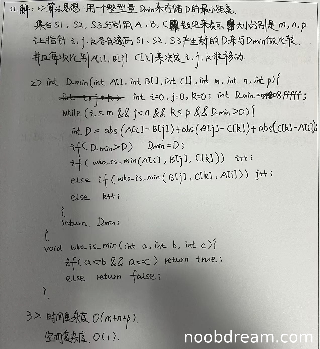 理由:学生的算法思想基本正确,提出了使用三个指针遍历三个数组,通过比较当前三元组的距离来更新最小距离,并移动指向最小元素的指针。这与标准答案中的方法二(同向多指针)思路一致。但学生的描述中缺少对"移动三个指针中指向元素最小的指针"这一关键点的明确说明,只是简单说"比较A[i],B[j],C[k]来决定谁移动",表述不够完整和准确。