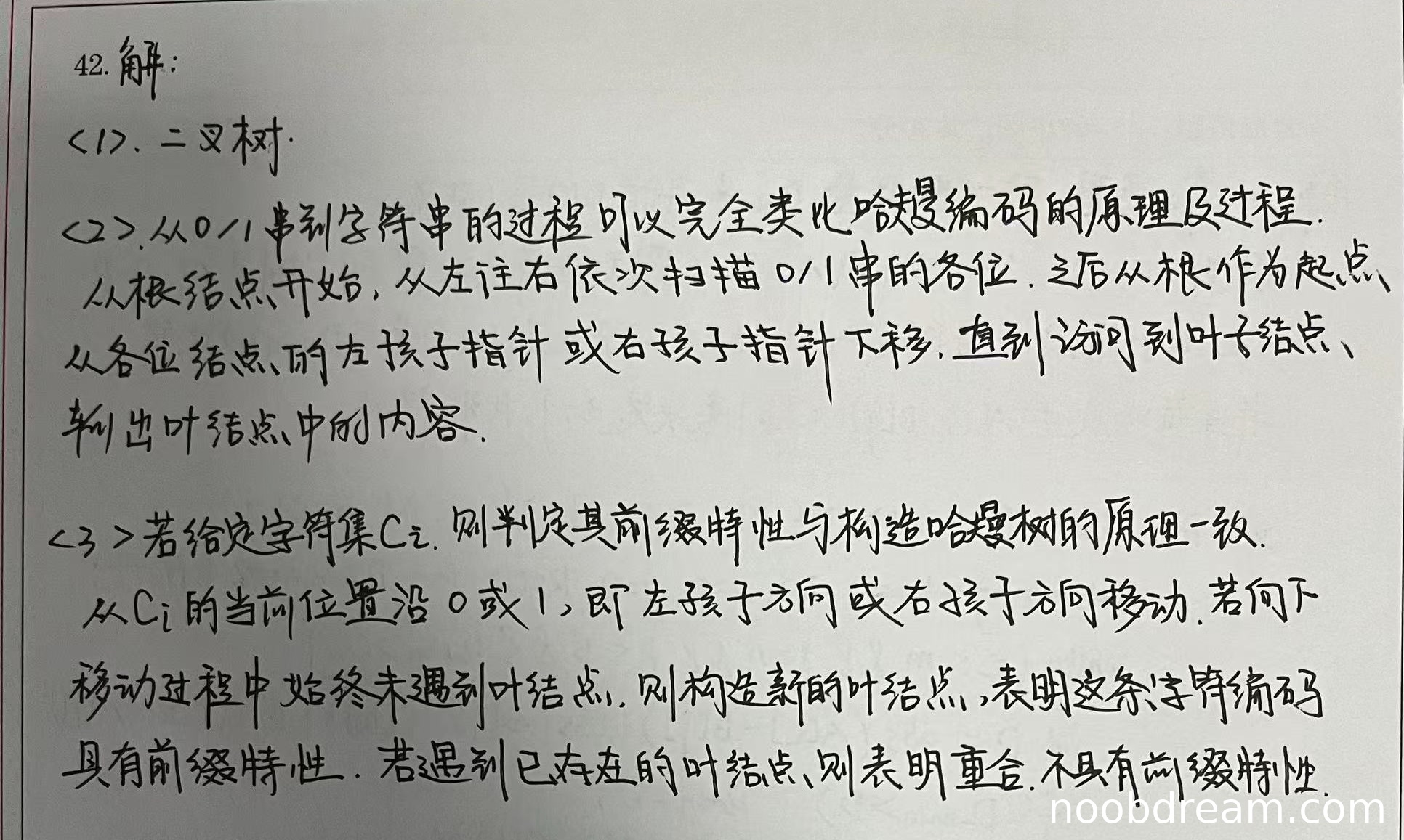 学生提到“从Ci的当前位置沿0或1移动”,但表述模糊(“Ci的当前位置”不清晰),且错误地提到“构造新的叶结点”(判定过程不应构造新节点,而是检查是否遇到叶节点或冲突)。核心逻辑有误,扣2分。得1分。