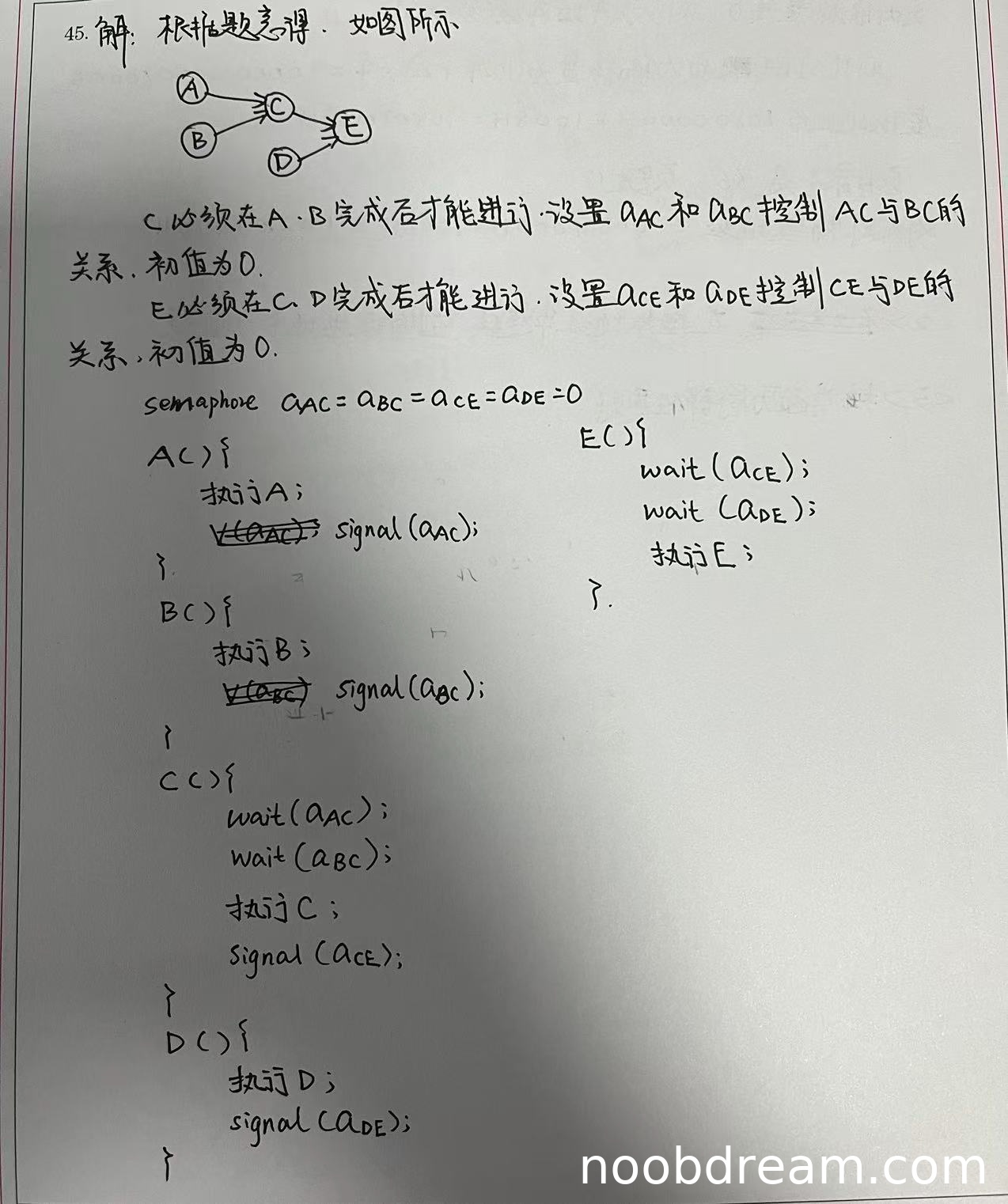 学生答案正确地识别了所有同步关系:C依赖于A和B,E依赖于C和D。为每个同步关系设置了对应的信号量(aAC, aBC, aCE, aDE),并正确地将它们的初值设为0。在代码中,每个进程正确地使用了wait和signal操作(或V操作)来实现同步:A和B完成后分别signal对应的信号量,C需要wait两个信号量后才能执行,执行后signal通知E;D完成后signal通知E;E需要wait两个信号量后才能执行。逻辑与标准答案完全一致。