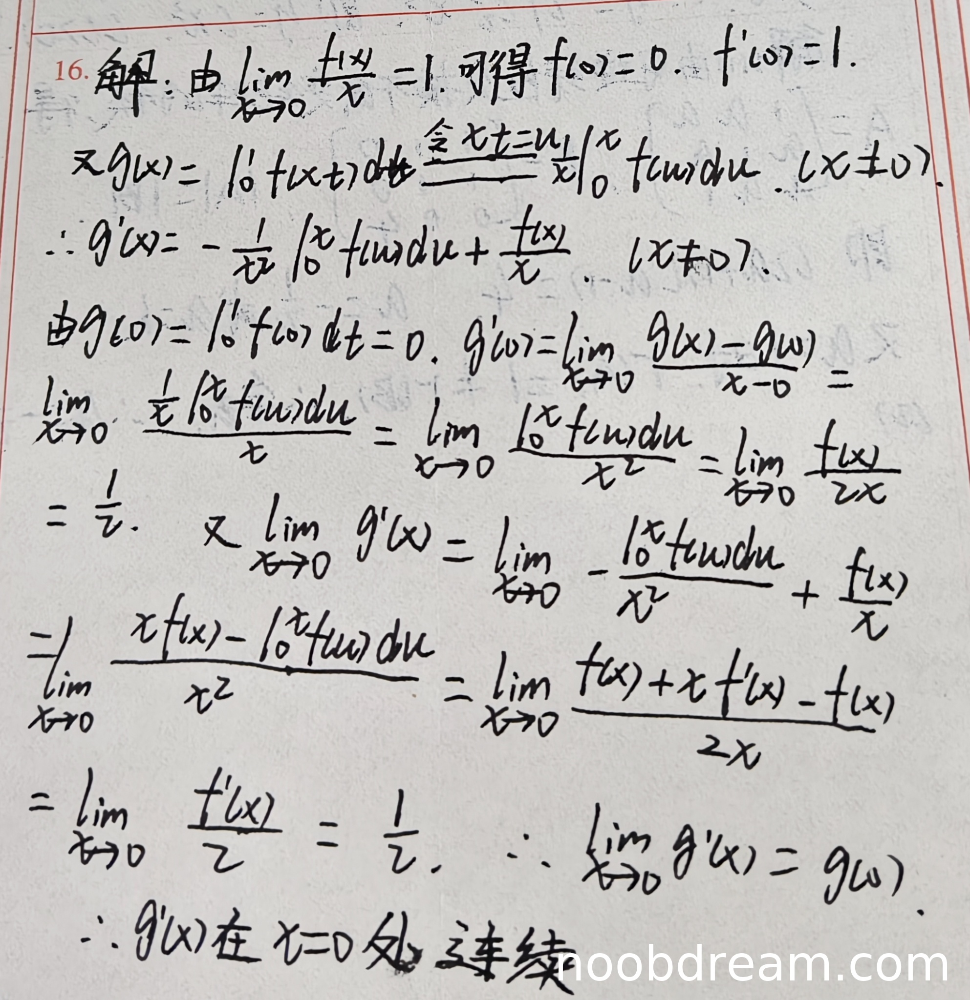 虽然学生正确得出f(0)=0,且最终结论g'(x)在x=0连续正确,但由于核心概念理解错误导致整个解题过程无效。