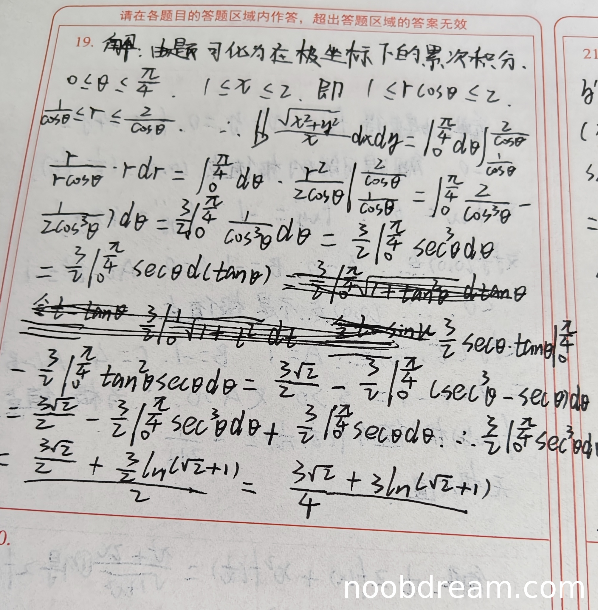学生正确地将积分区域D转化为极坐标下的累次积分,确定了θ的范围为0到π/4,r的范围为secθ到2secθ,并正确设置了被积函数在极坐标下的形式。在计算r的积分时,学生正确计算了∫r dr,并代入上下限得到(3/2)∫sec³θ dθ。这部分思路和计算完全正确,没有逻辑错误。