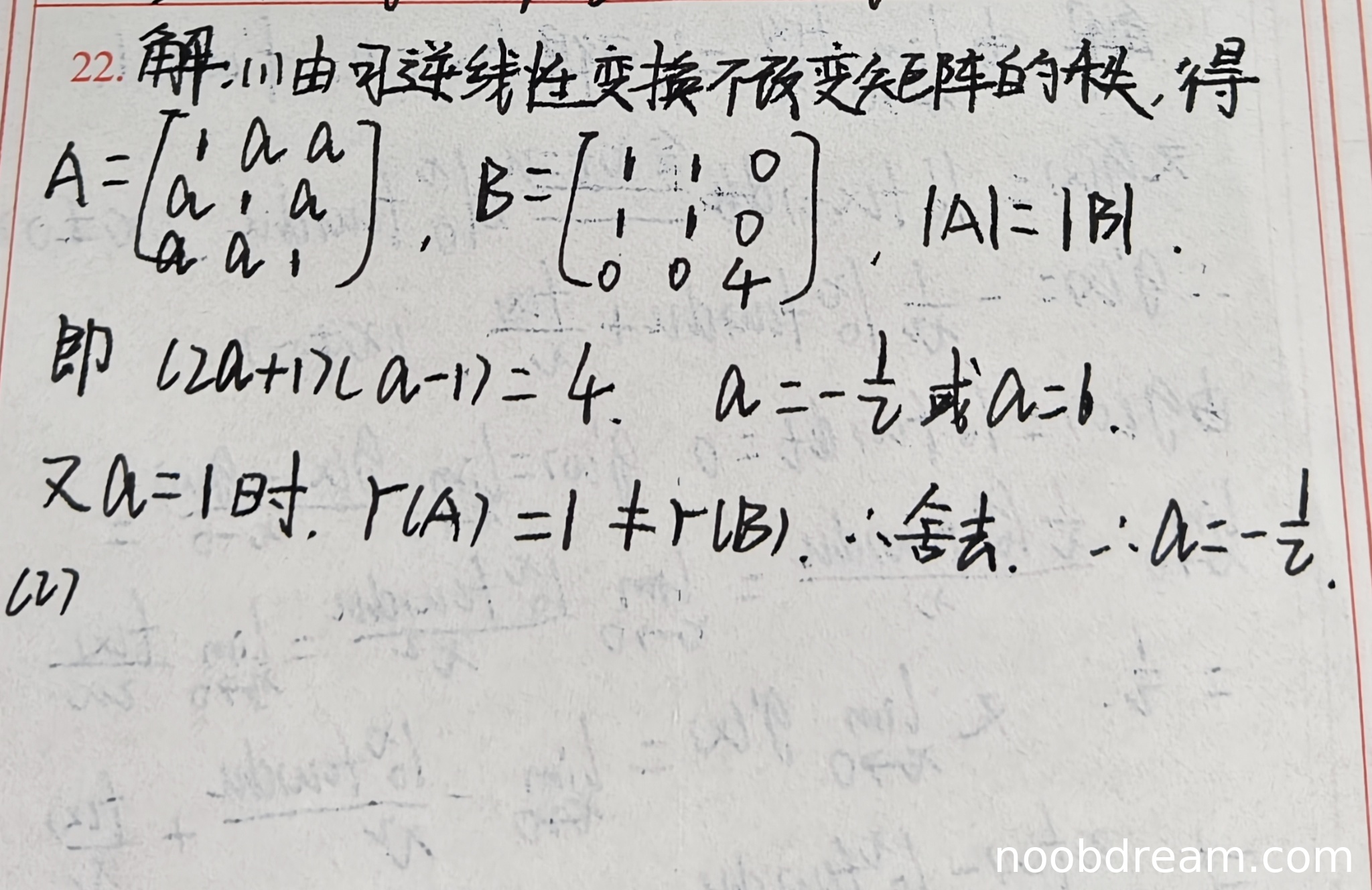尽管出发点错误,但学生通过额外的秩检验排除了错误解,最终得到了正确答案 a = -1/2。由于思路正确(利用秩)且最终答案正确,但核心逻辑(行列式相等)错误,因此酌情扣分。