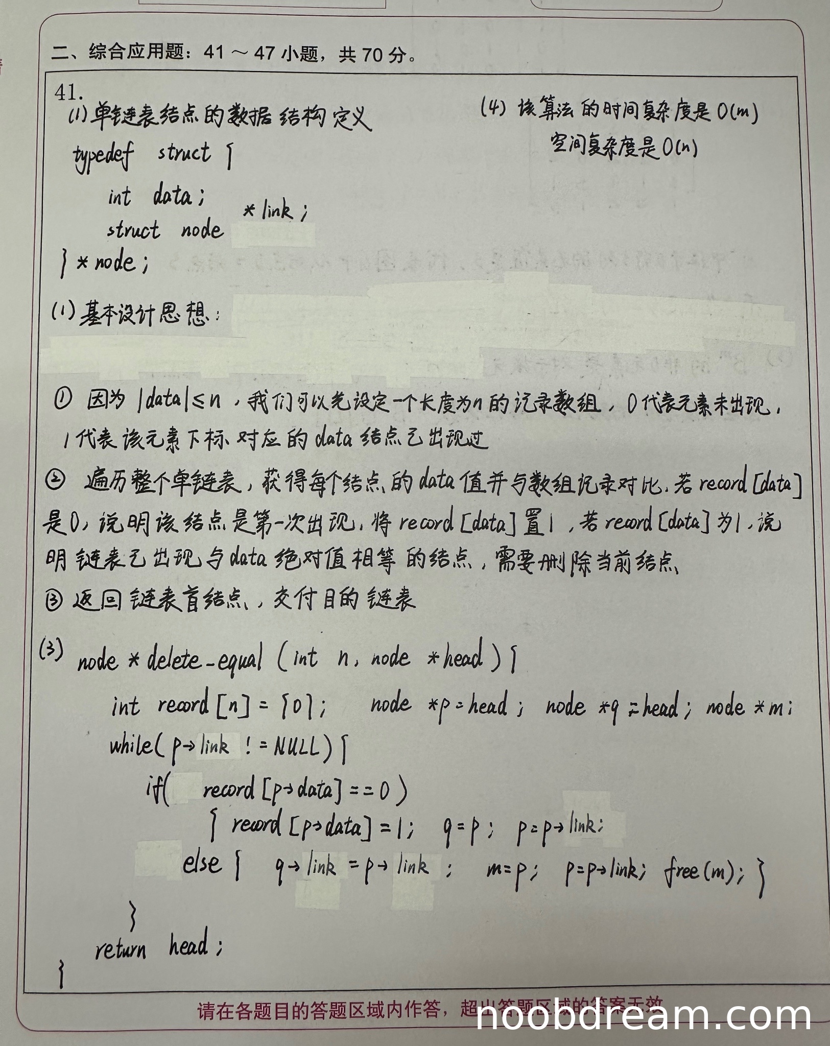 理由:代码实现存在多个逻辑错误:①函数名"delete-equal"不合法(含减号);②未处理data的绝对值,直接使用p->data作为下标;③记录数组长度应为n+1而非n;④初始化方式"int record[n] = {0}"在C中不一定合法(变长数组初始化);⑤指针q的使用逻辑不清晰,在删除操作时可能出错;⑥未考虑头结点的处理。但基本框架正确,使用了辅助数组的思路。