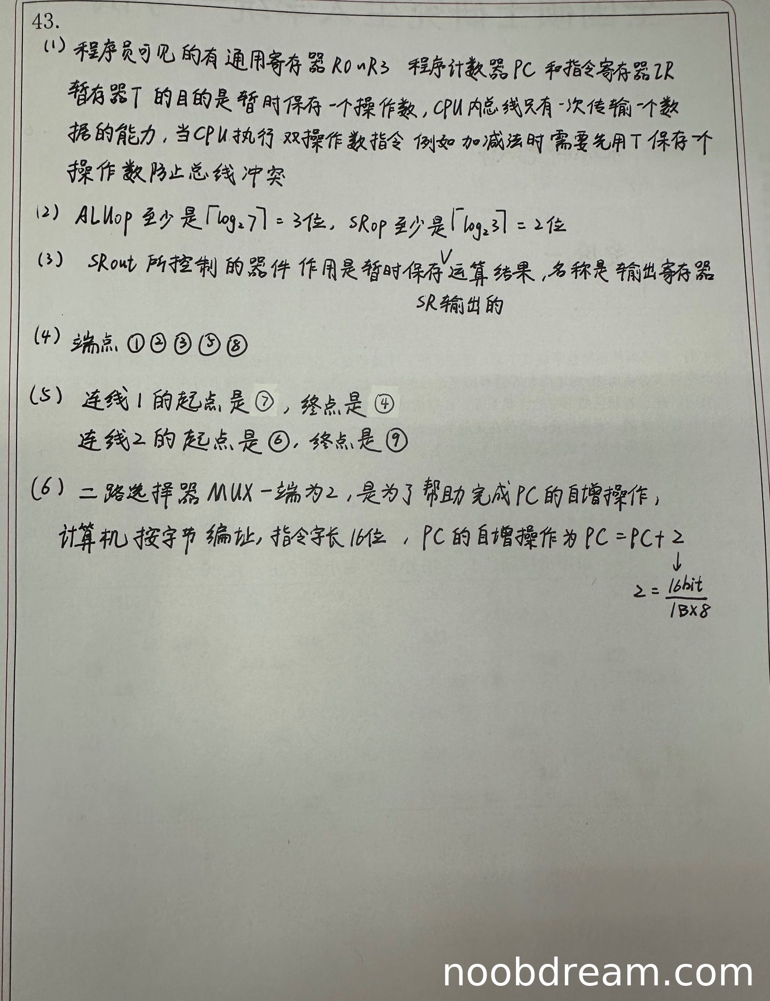 学生答案中提到了程序员可见的寄存器包括R0~R3和PC,这是正确的;但错误地包含了IR(指令寄存器),IR对程序员不可见。暂存器T的作用解释正确(防止总线冲突、暂存操作数)。根据标准答案,答对通用寄存器和PC得2分,暂存器T的作用得1分,但多答IR不扣分(识别问题或误写)。因此得3分。